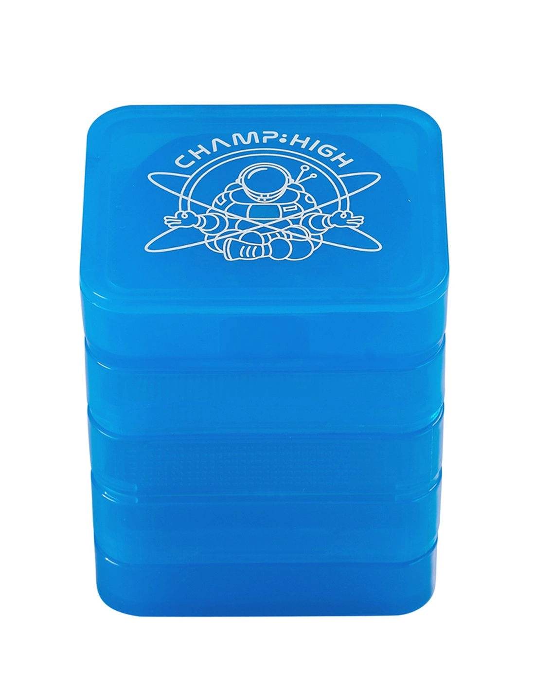 Grinder en plastique bleu Champ High de forme carrée munis de 4 parties dont 1 pour récolter le pollen de vos herbes préférées. Ce grinder est carré fait 49mm de côté et 40mm de hauteur, son diamètre intérieur est quant à lui de 40mm.