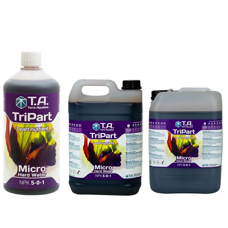 Disponible en formule « eau douce » et « eau dure », TriPart Micro est le fondement de notre système d’engrais. Il contient des micro- et sub-éléments ainsi que des macro-éléments complémentaires. Utiliser TriPart Micro comme indiqué, sur toute la durée de la croissance et de la floraison.