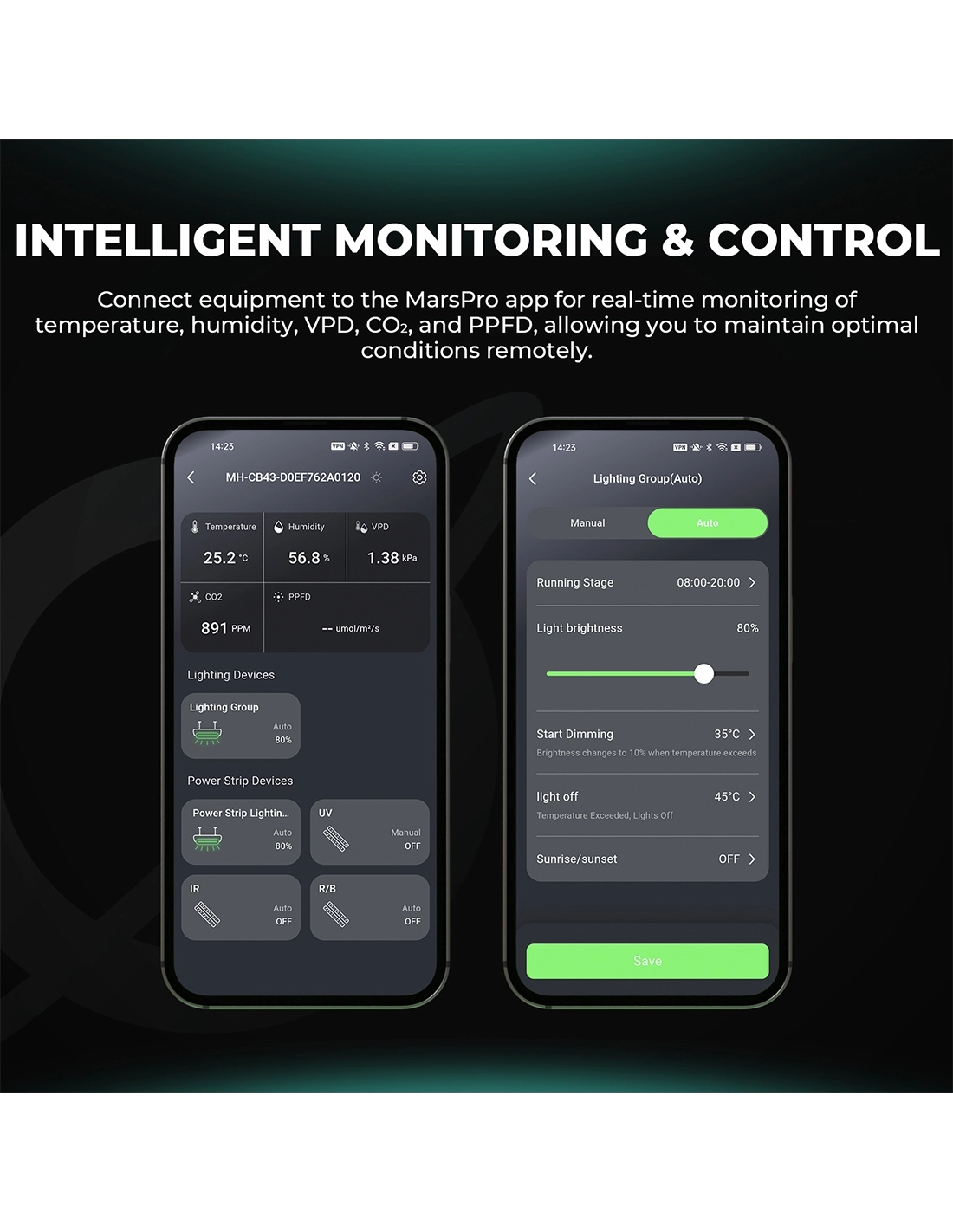Le Controller 43 Set est le système d’automatisation tout-en-un conçu pour contrôler, surveiller et optimiser votre culture d’intérieur. Il permet une surveillance complète de la température, de l’humidité, du VPD, du CO2 et du PPFD, avec des ajustements précis de l’intensité lumineuse et des stratégies de croissance des plantes, garantissant que vos plantes se développent dans des conditions idéales.