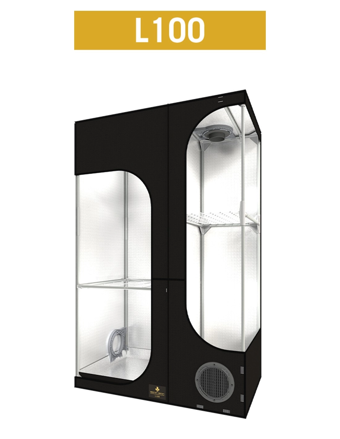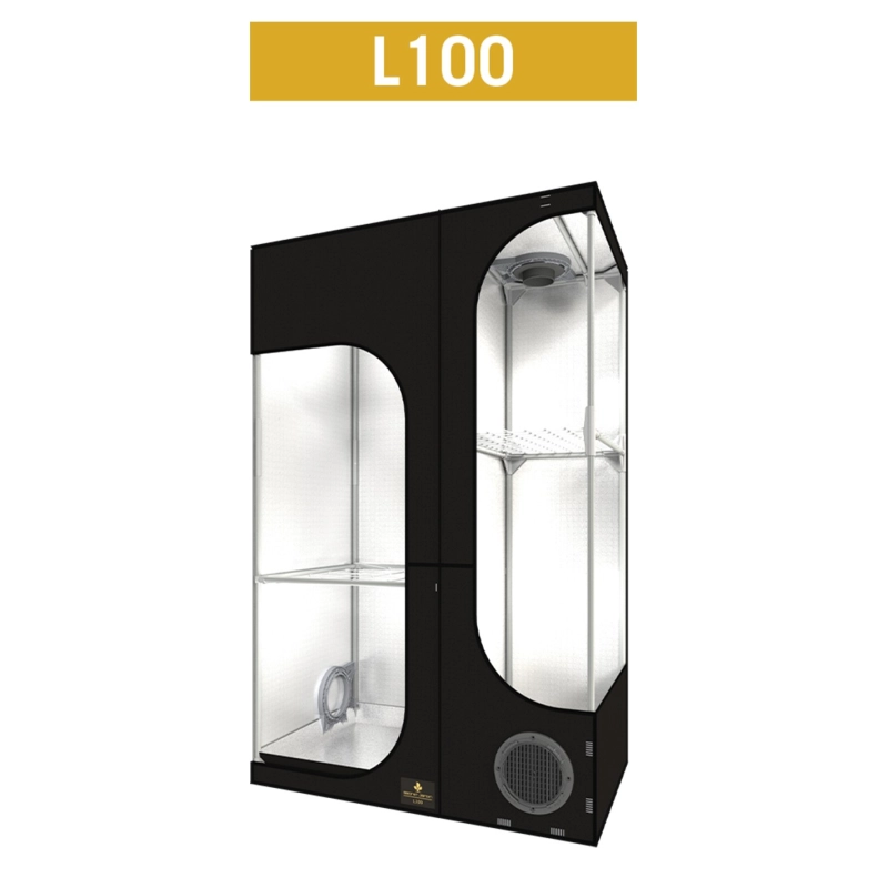 La nouvelle révision 4.0 du Lodge 100 de chez Secret Jardin. Cette ensemble 2 en 1 vous permet de combiner la phase de croissance et de floraison dans la même box. 2 espaces pour le développement (100x40x100cm) et d’un espace de floraison (120x120x198cm)