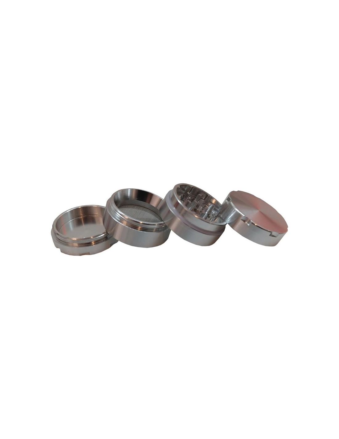 Grinder aluminium éloxé en 4 parties avec récupérateur de pollen. Ses dents taillées en losanges vous donneront une coupe parfaite. Son joint teflon vous assurera une glisse sans faille.