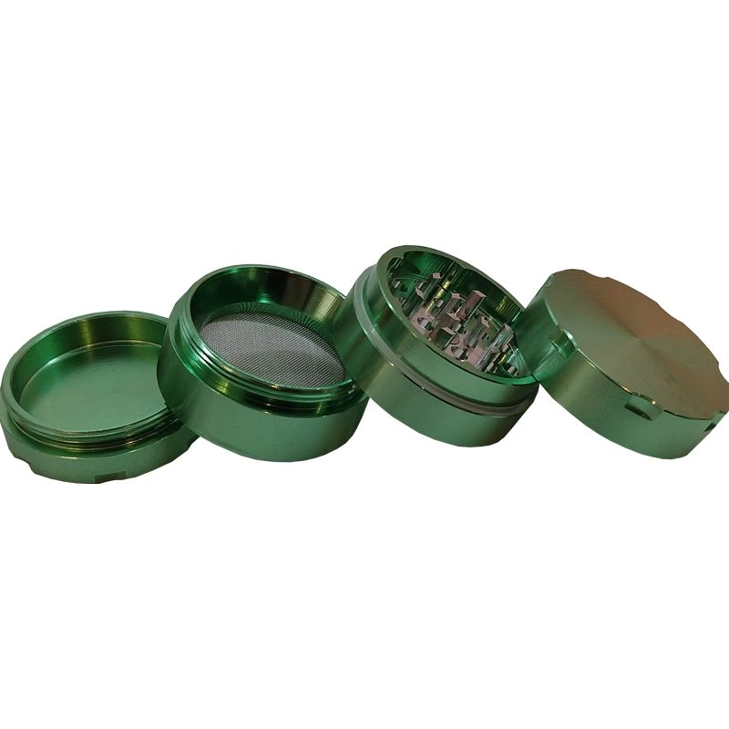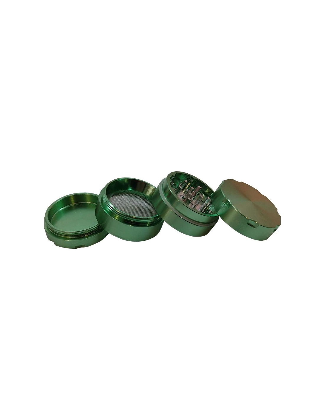 Grinder aluminium éloxé en 4 parties avec récupérateur de pollen. Ses dents taillées en losanges vous donneront une coupe parfaite. Son joint teflon vous assurera une glisse sans faille.