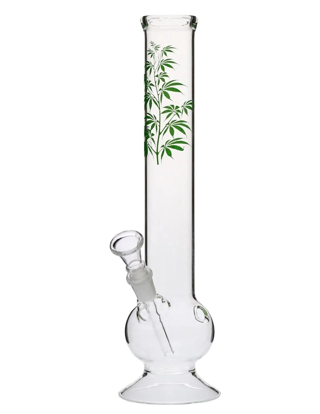 Bong en verre transparent avec motif "Plante de cannabis" de couleur verte.
