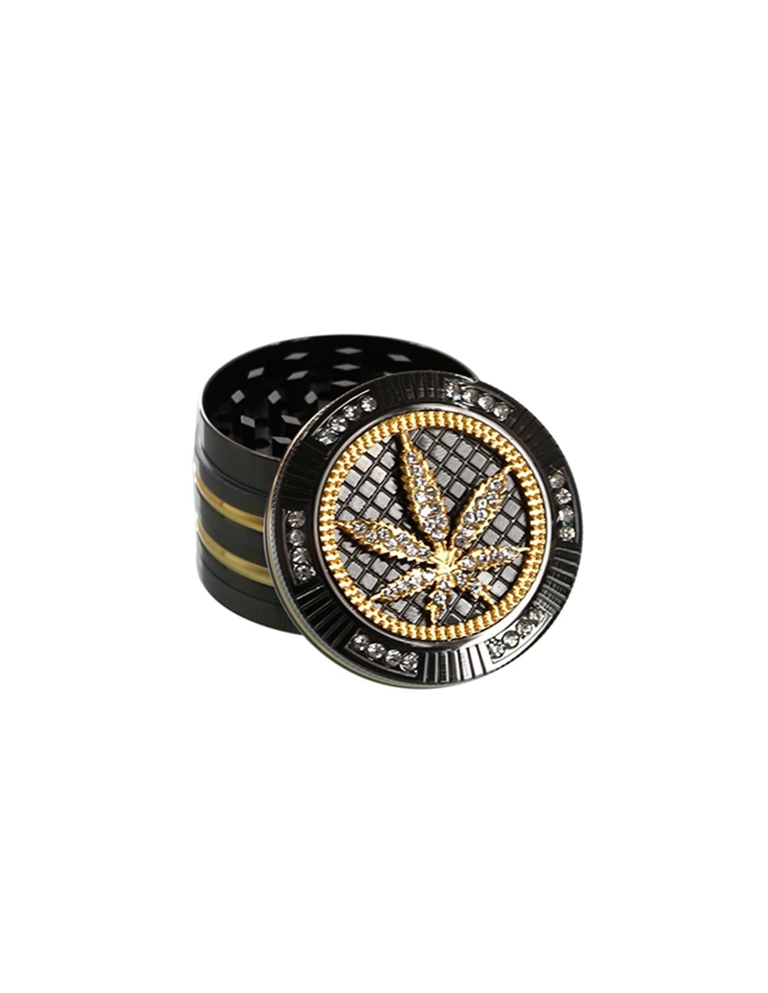 Grinder en métal anthracite d'un diamètre de 55mm avec une feuille de cannabis dorée et des strass. Ce grinder se compose de 4 parties dont une pour récolter le pollen.
