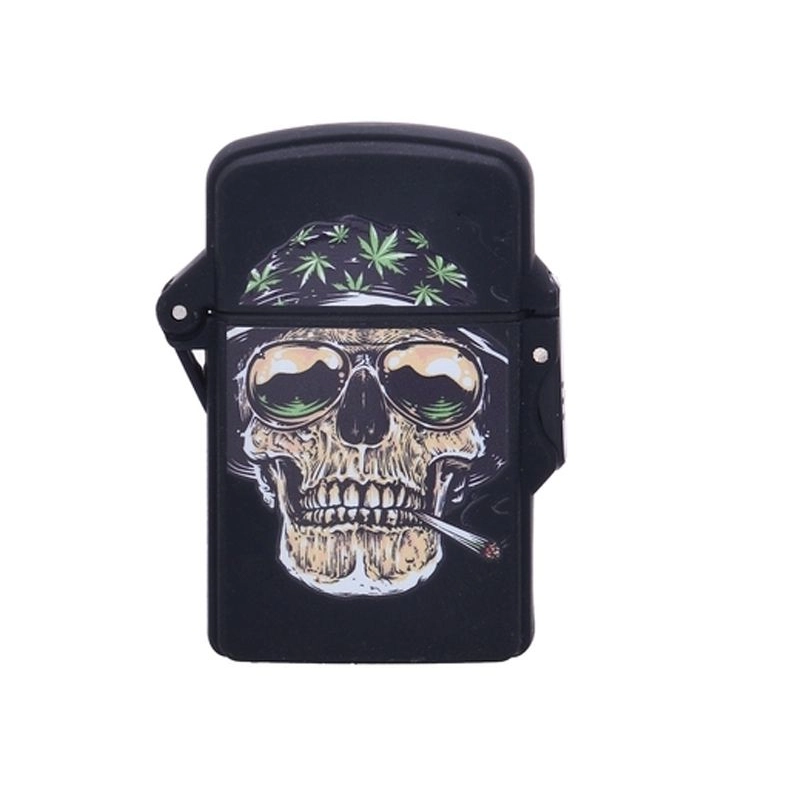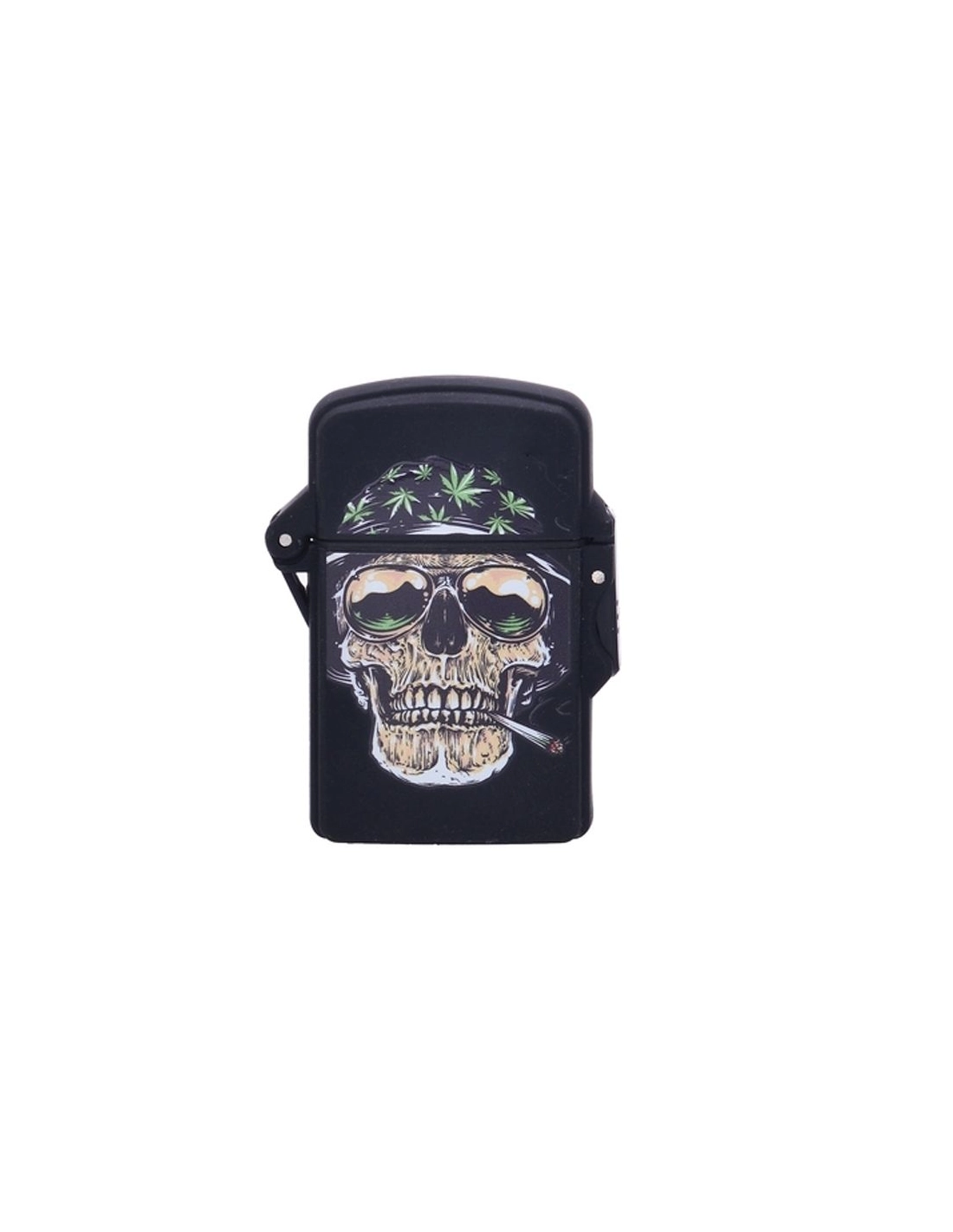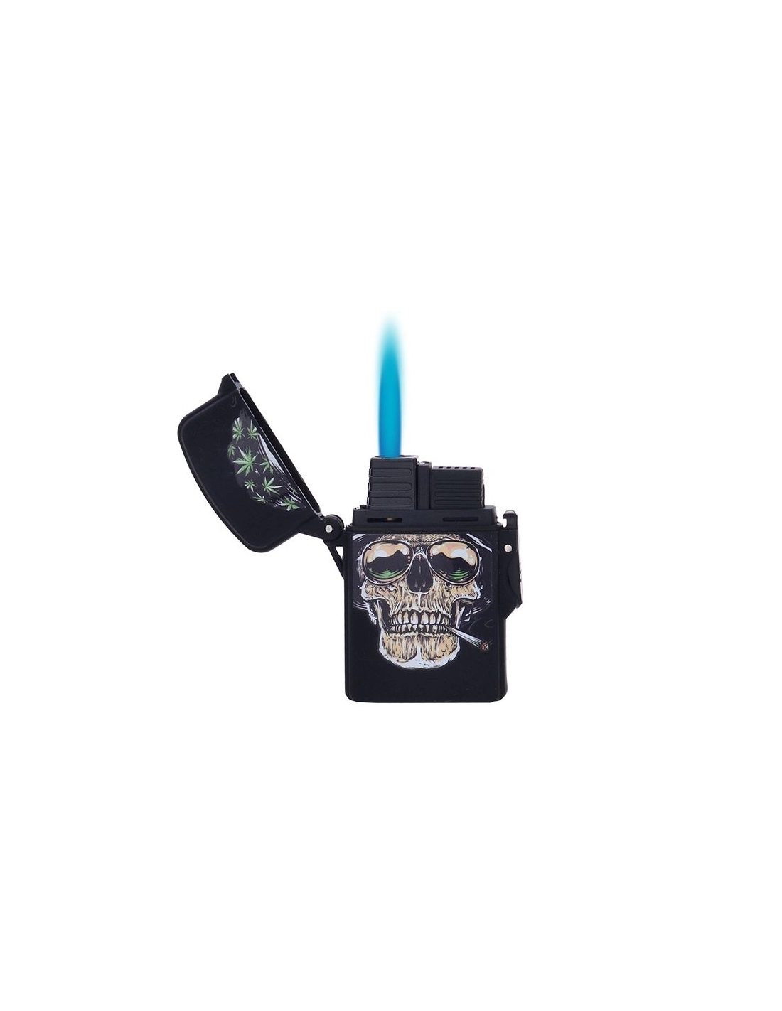 Briquet rechargeable de type chalumeau avec couvercle comme un zippo, il est de couleur noire avec une tête de mort portant un bandana avec des feuilles de cannabis.