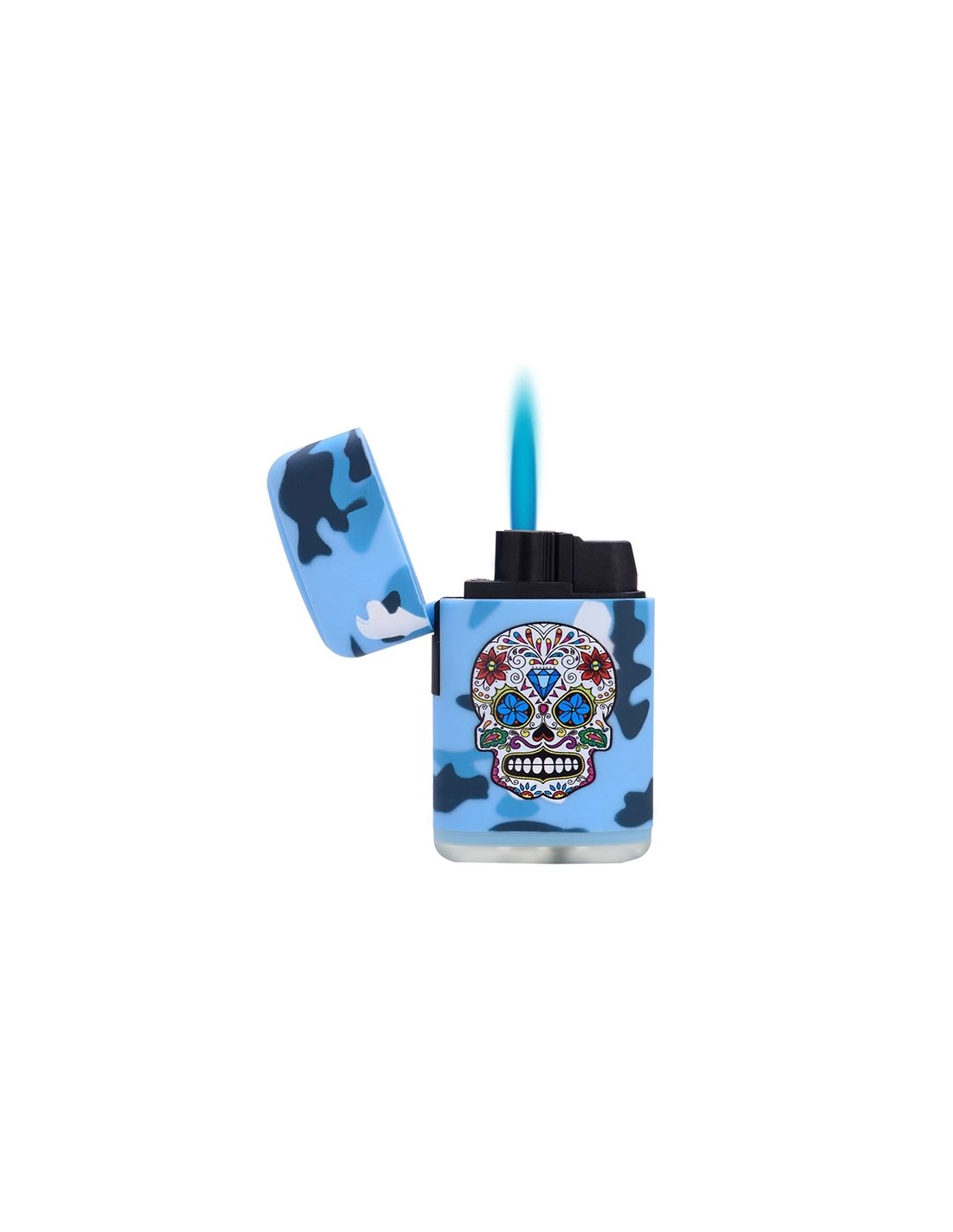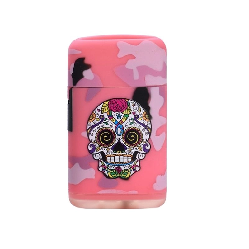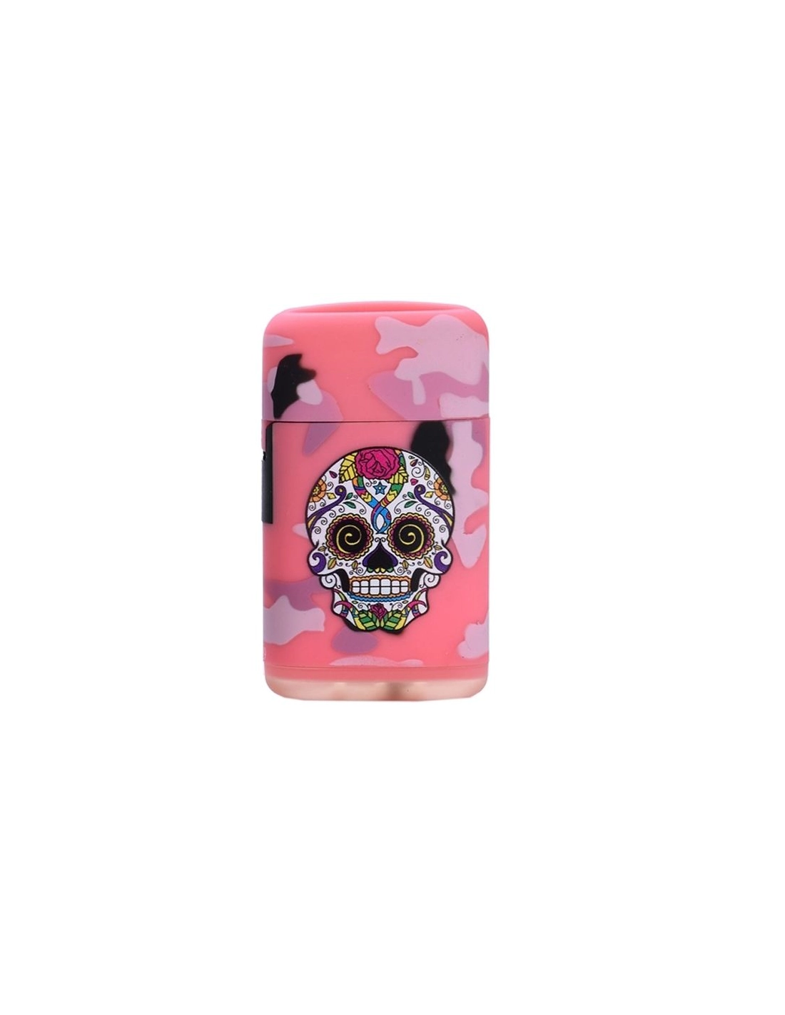 Briquet rechargeable de type chalumeau avec couvercle comme un zippo, il est de couleur rose avec une tête de mort mexicaine