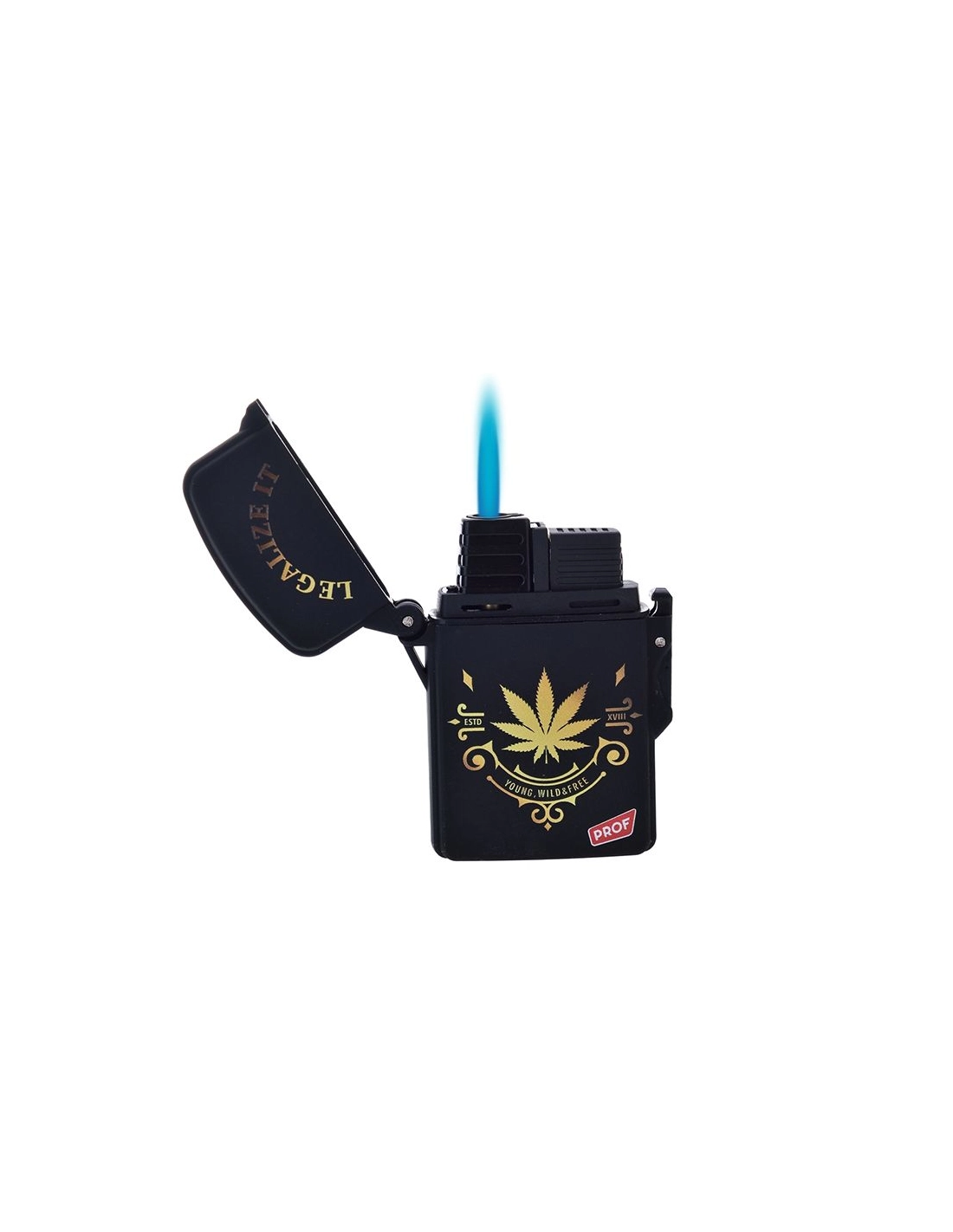 Briquet rechargeable de type chalumeau avec couvercle comme un zippo, il est de couleur noir avec écrit Legalize It en doré