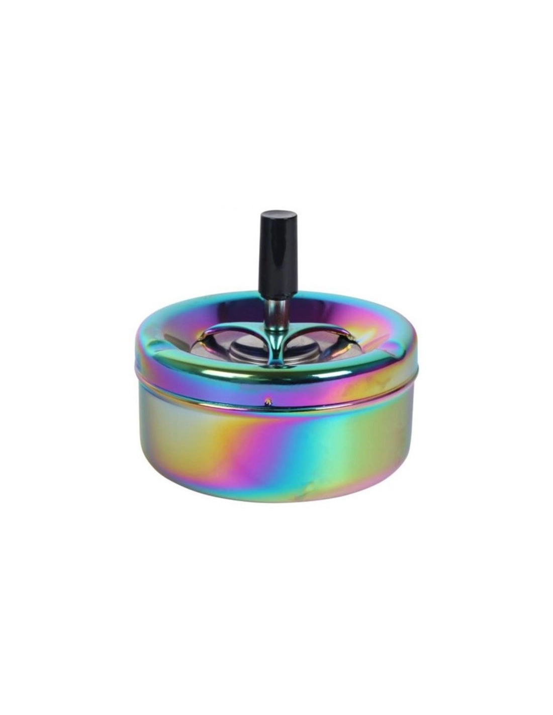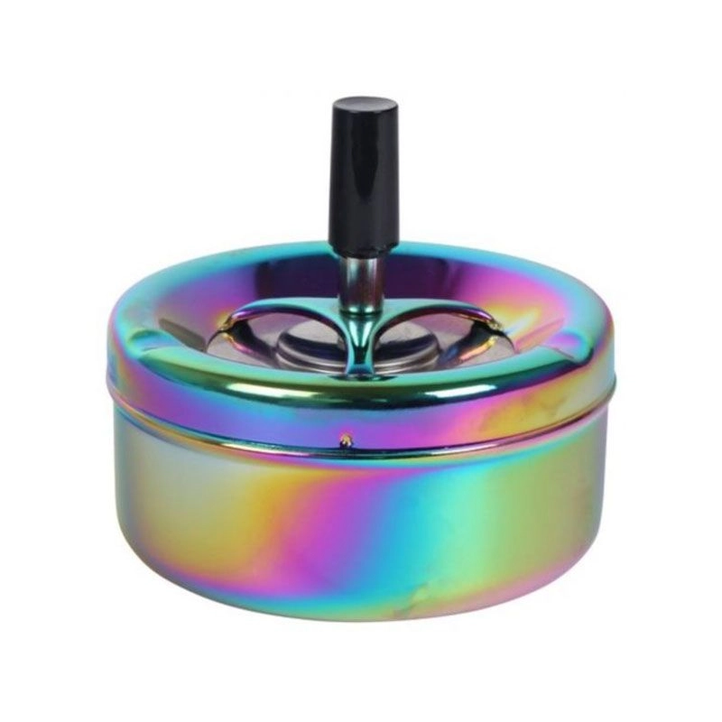 Cendrier de couleurs arc-en-ciel en métal d'un diamètre de 9cm avec un poussoir pour éviter que vos cendre ne sortent du cendrier.
