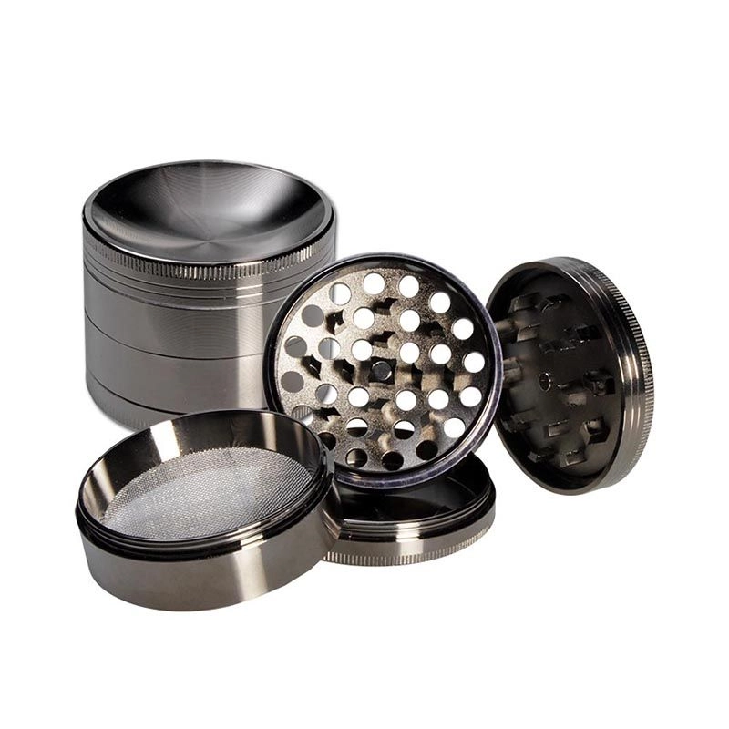 Grinder en métal 4 parties avec un couvercle concave comprenant un tamis qui vous permet de récupérer le pollen de votre CBD.