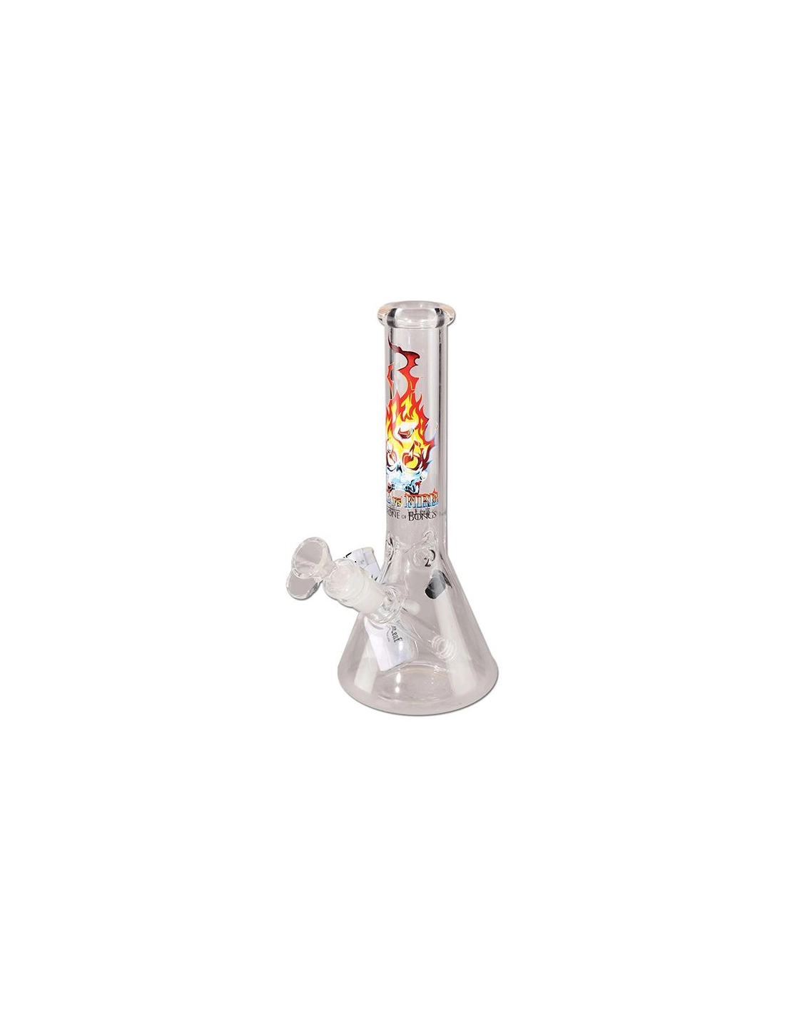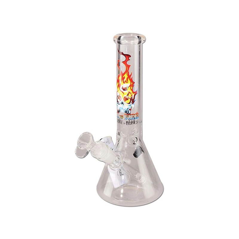 Bong de marque Black Leaf en verre borosilicate d'une hauteur de 25cm avec une tête de mort en flamme sur l'avant du bong.