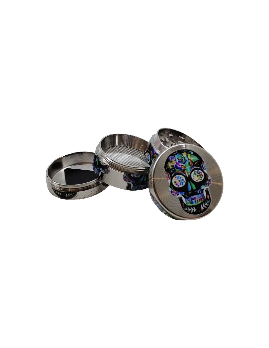 Grinder de marque Champ High en 4 parties avec un diamètre de 40mm vous permettant de récolter le pollen de votre CBD. Ce magnifique grinder est décorer avec des crâne mexicain avec des fleurs arc en ciel
