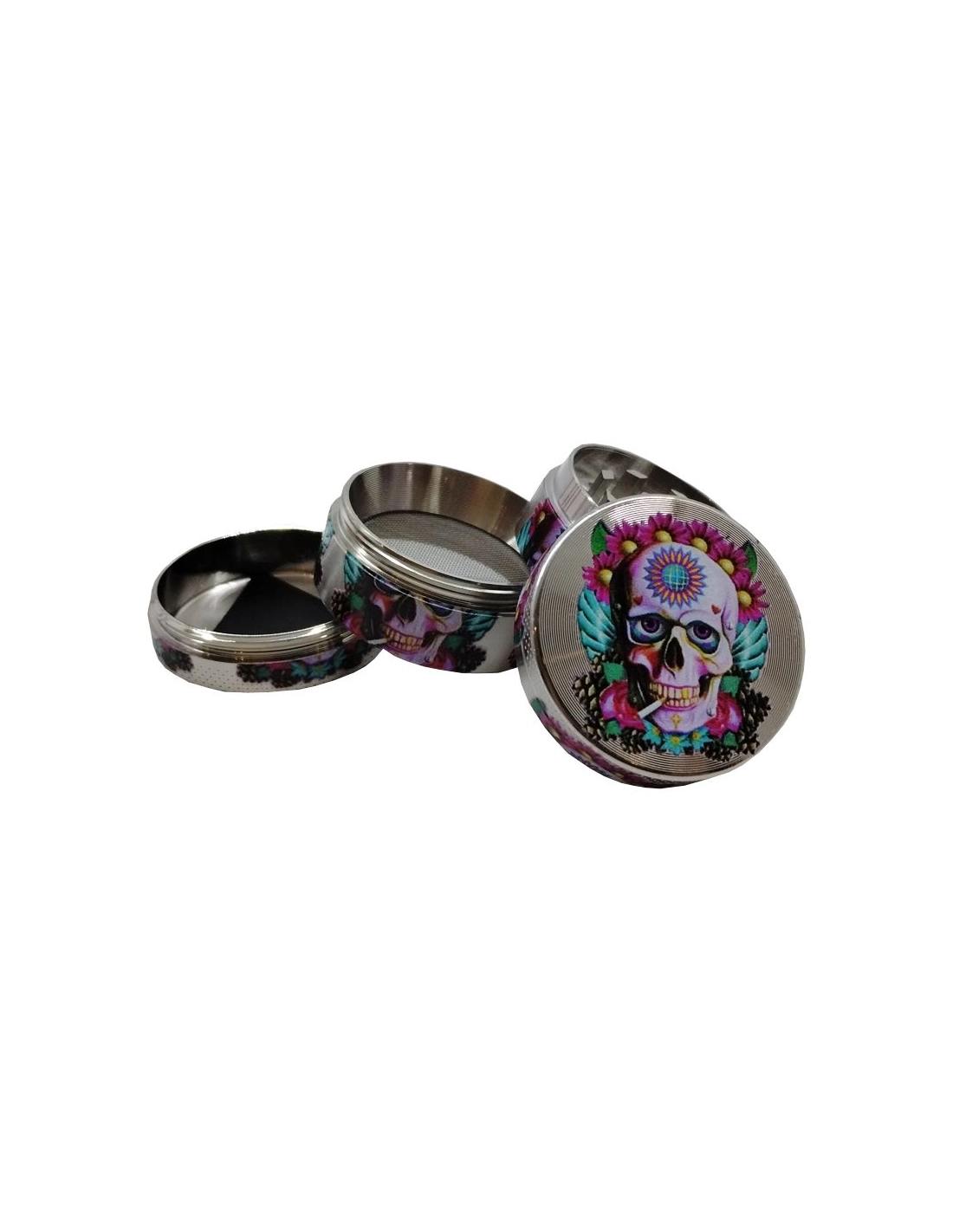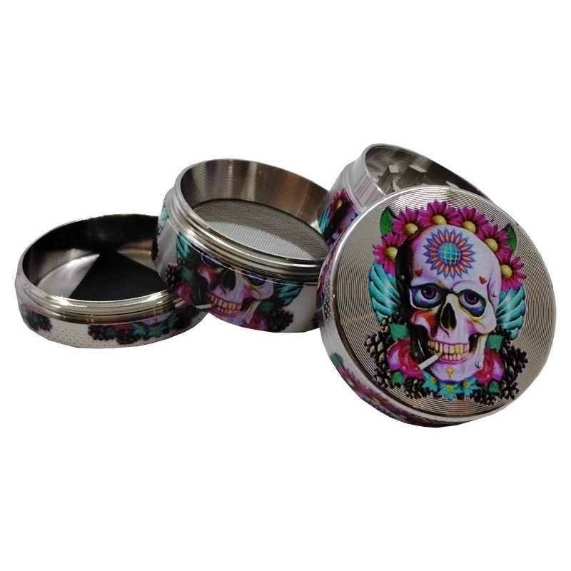 Grinder de marque Champ High en 4 parties avec un diamètre de 40mm vous permettant de récolter le pollen de votre CBD. Ce magnifique grinder est décorer avec des crâne mexicain avec des fleurs décoratives roses