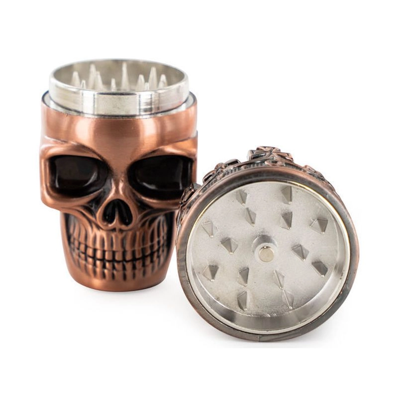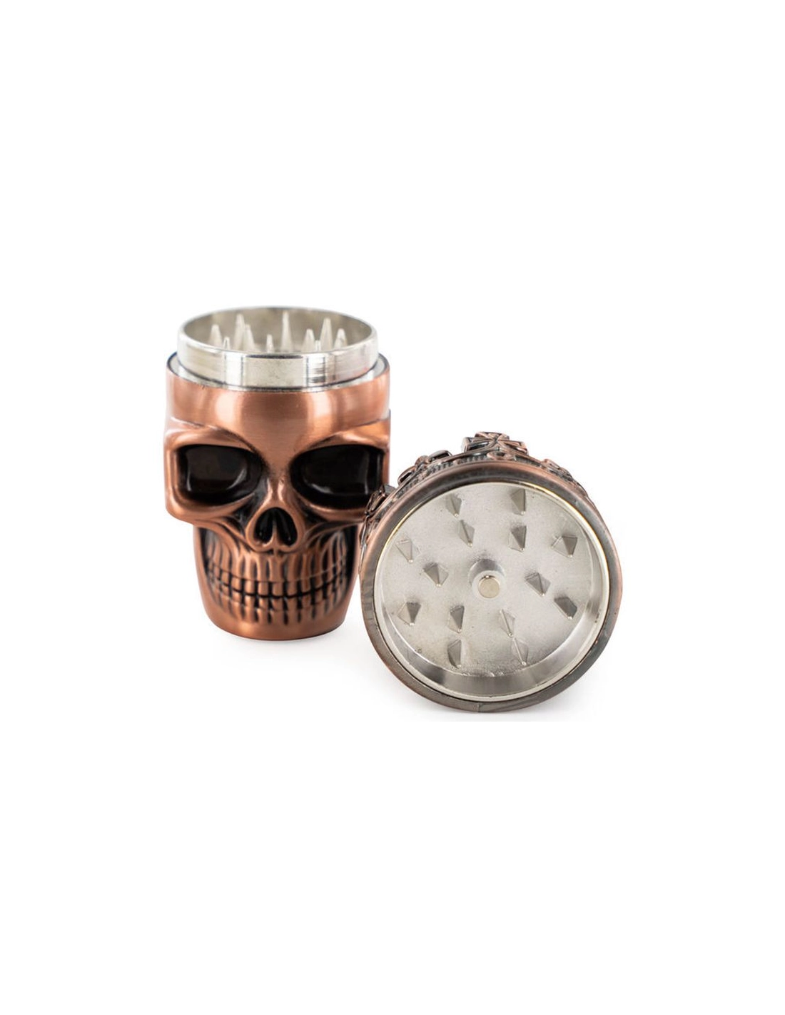 Grinder de marque Champ High en forme de tête de mort avec une couronne sur la tête et comportant 3 parties dont une avec un tamis qui permet de récolter le pollen de vote CBD.