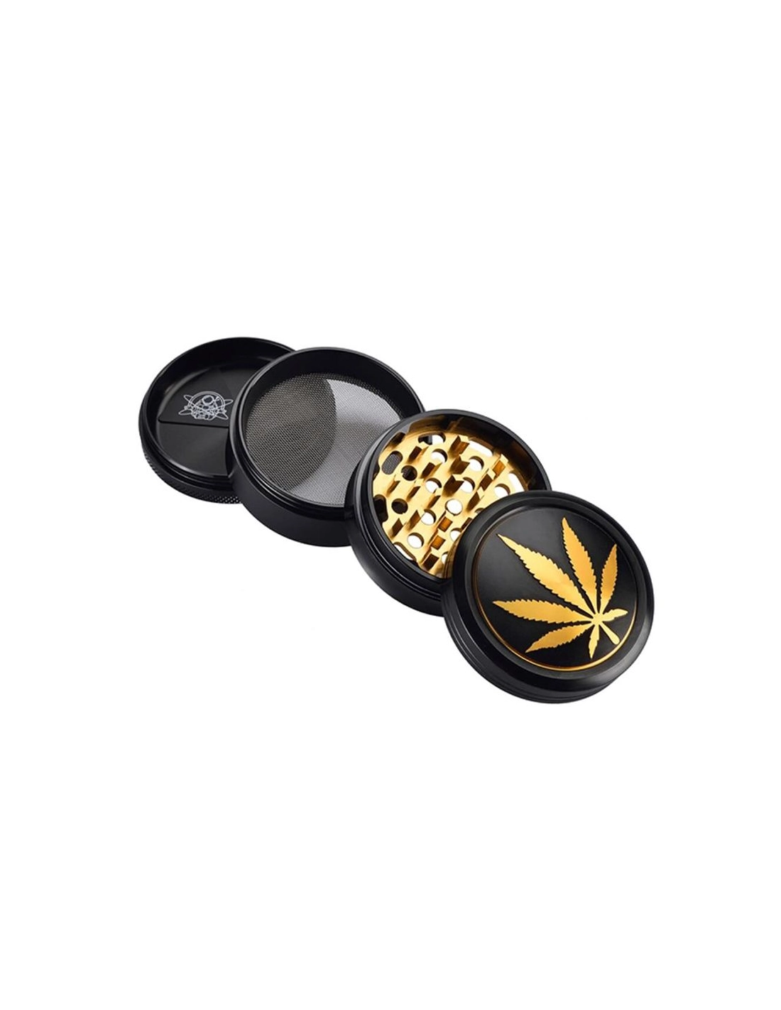 Superbe grinder en métal ayant un diamètre de 63mm avec 4 parties dont une avec un tamis qui vous permets de récolter le pollen de votre herbe CBD et sur le dessus du grinder, vous avez une feuille de cannabis dorée.