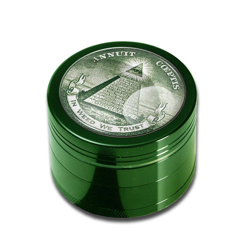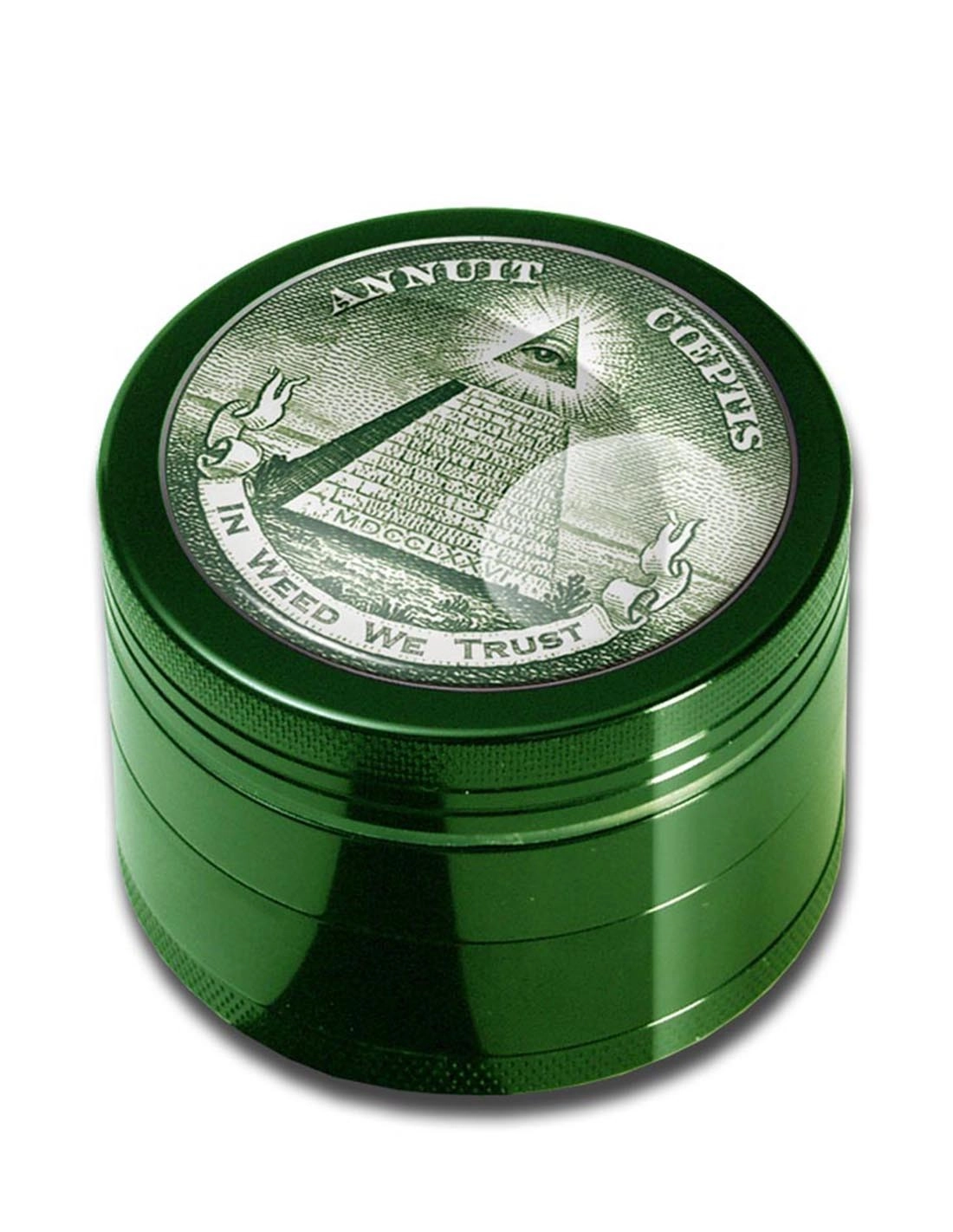 Grinder CNC Ø 50mm, 4 parties métal gris, motif "In Weed we Trust" ,avec tamis pour récupération de résines