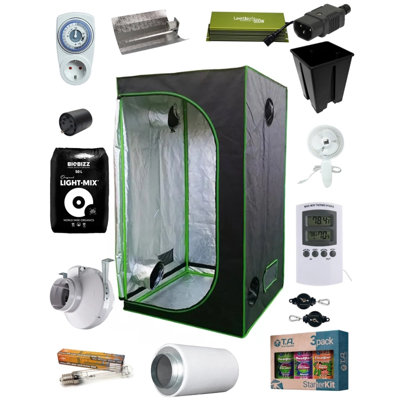 Kit de culture complet avec box Black Room 100 de 100 x 100 x 200cm avec ballast électronique réglable sur 250-400-600W. L’offre comprend tout le matériel nécessaire pour une culture en intérieur réussie, avec 16 pots de 3.6lt.