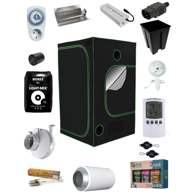 Kit de culture complet avec box Black Room 240L de 120 x 240 x 200cm avec un ballast électronique réglable sur 250-400-600W. L’offre comprend tout le matériel nécessaire pour une culture en intérieur réussie, avec 50 pots de 3.6lt.