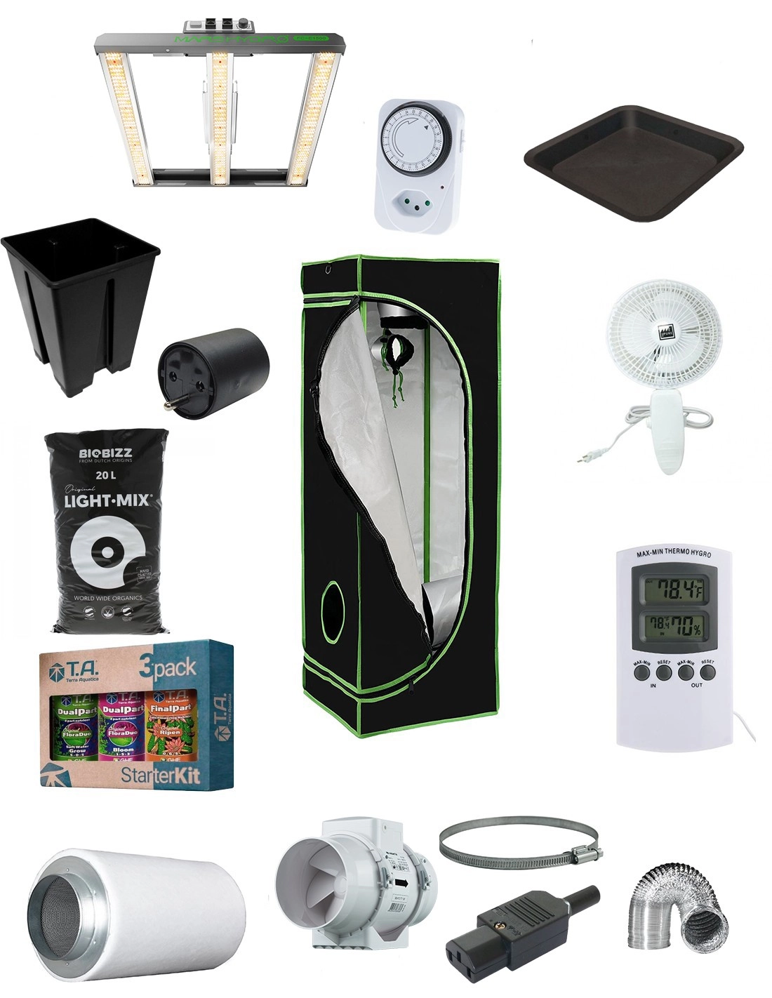 Kit de culture indoor d'une dimensions de 60 x 60 x 160cm avec un panneau LED Mars Hydro Smart FC-E 1500 ainsi que tout le matériel nécessaire pour cultiver vos plantes jusqu'à la récolte.