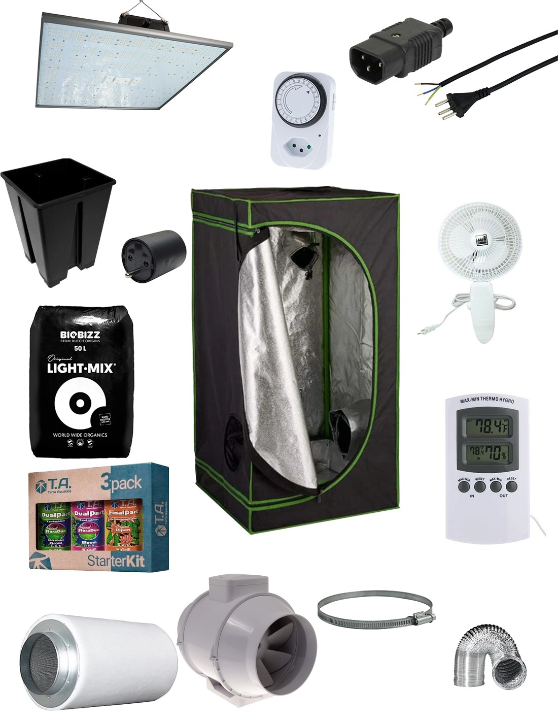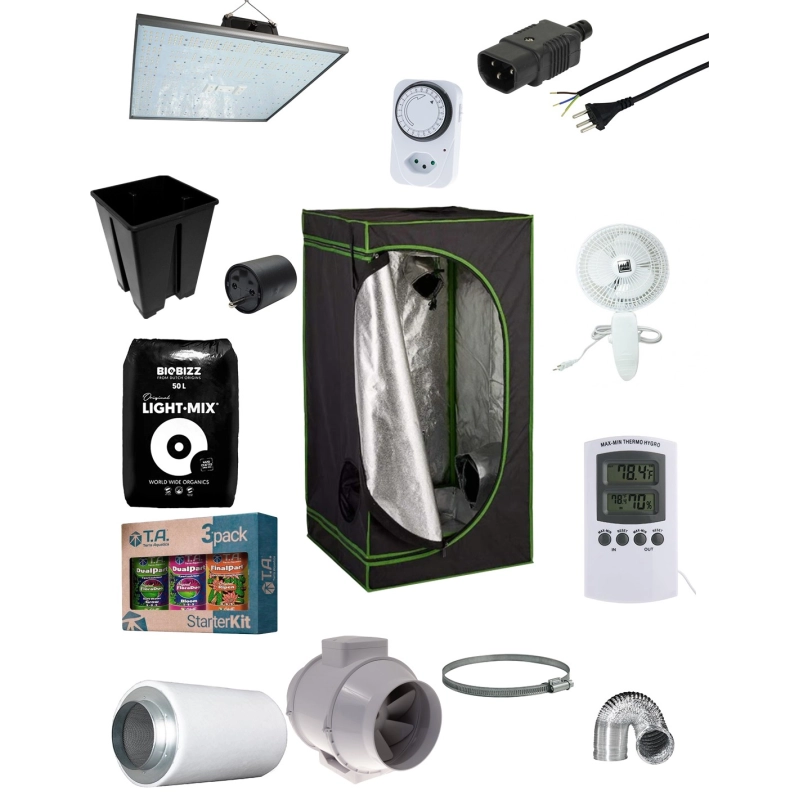 Kit de culture indoor avec un box d'une dimensions de 80 x 80 x 180cm avec un panneau LED horticole Pure LED Q 240 ainsi que tout le matériel utile pour faire une récolte complète.