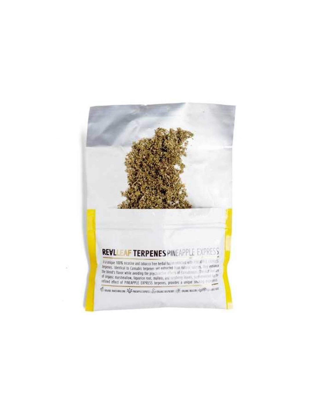 Le substitut de tabac REAL LEAF Pineapple Express avec Terpènes est un mélange unique de plantes sans tabac et sans nicotine, enrichi de Terpènes Pineapple Express.