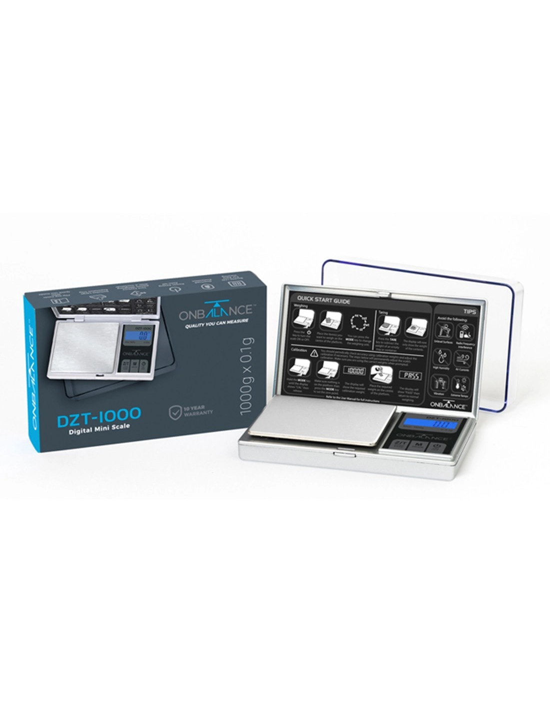 Präzisionswaage mit einer Kapazität von maximal 1000gr für eine Genauigkeit auf das Zehntel. Abmessungen: 12,8 x 7,8 x 2 cm