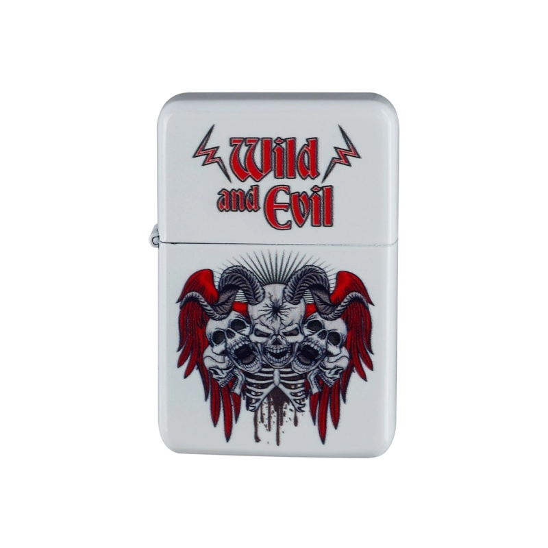 Benzinfeuerzeug aus Metall in weißer Farbe mit den Aufschriften Wild and Evil und Totenköpfen mit Hörnern und Flügeln. Um dieses Benzinfeuerzeug zu verwenden, benötigen Sie Zipperbenzin.