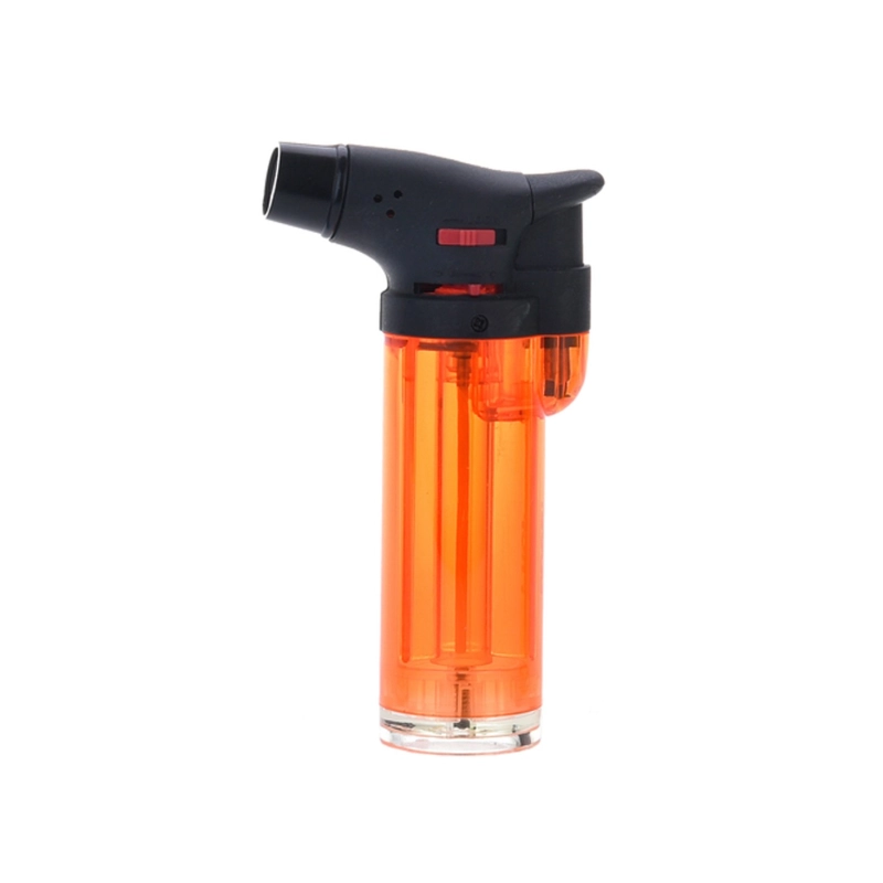 Nachfüllbares, orangefarbenes Schneidbrenner-Feuerzeug mit einem Einstellrad für die Flamme sowie einem Rädchen zum Arretieren des Knopfes.