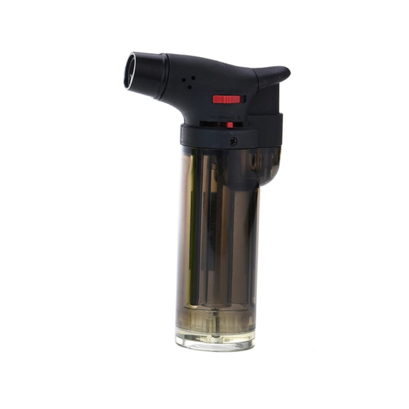 Nachfüllbares, schwarzes Bunsenbrennerfeuerzeug mit einem Einstellrad für die Flamme sowie einem Rädchen zum Arretieren des Knopfes.