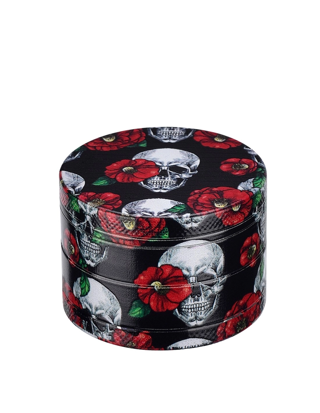 Grinder mit 50 mm Durchmesser aus Metall mit 4 Fächern, von denen eines zum Auffangen der Pollen Ihrer Lieblingskräuter dient und mit Totenköpfen und Rosen verziert ist.