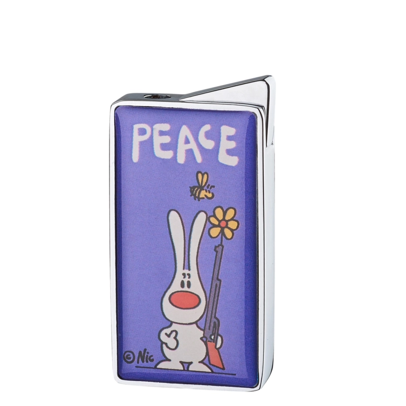 Dieses elektronische Feuerzeug aus Metall kommt im Kartenformat daher. Es ist mit jeder Art von Feuerzeuggas nachfüllbar und besitzt auf der Oberseite eine Abbildung von einem Hasen im Comic-Stil. Aus seiner Waffe ragt eine Blume hervor. Peace!