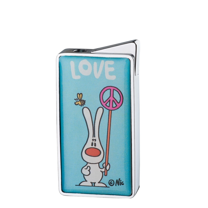 Dieses elektronische Feuerzeug aus Metall kommt im Kartenformat daher. Es ist mit jeder Art von Feuerzeuggas nachfüllbar und besitzt auf der Oberseite eine Abbildung im Comic-Stil von einem Hasen, der das Friedenssymbol in der Hand hält. Darüber der Schriftzug: Love!