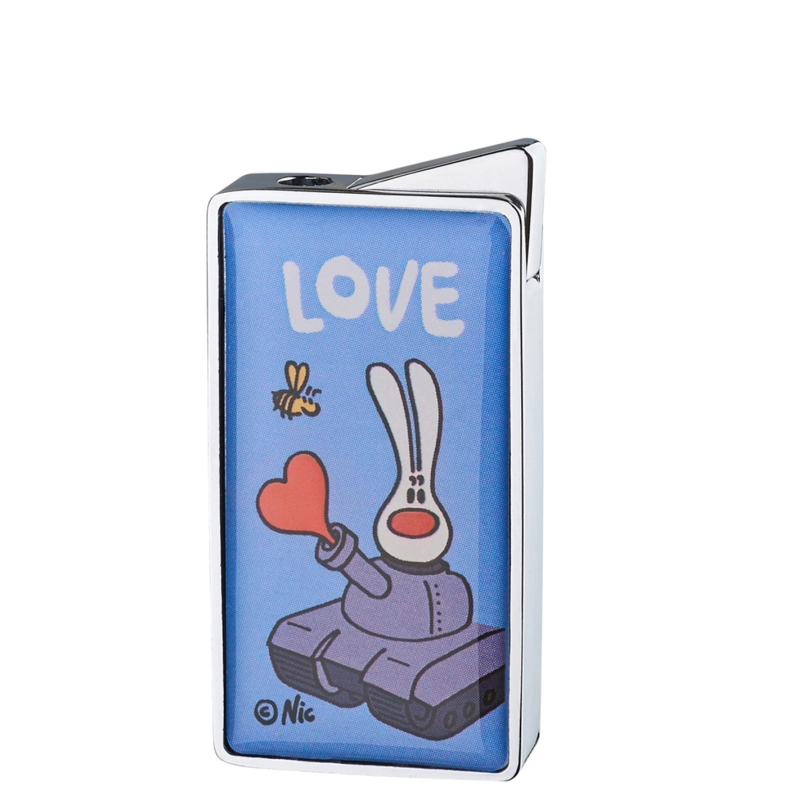 Dieses elektronische Feuerzeug aus Metall kommt im Kartenformat daher. Es ist mit jeder Art von Feuerzeuggas nachfüllbar und besitzt auf der Oberseite eine Abbildung im Comic-Stil von einem Hasen in einem Panzer, der ein Herz statt einer Kanonenkugel in den Himmel schiesst. Darüber der Schriftzug: Love!