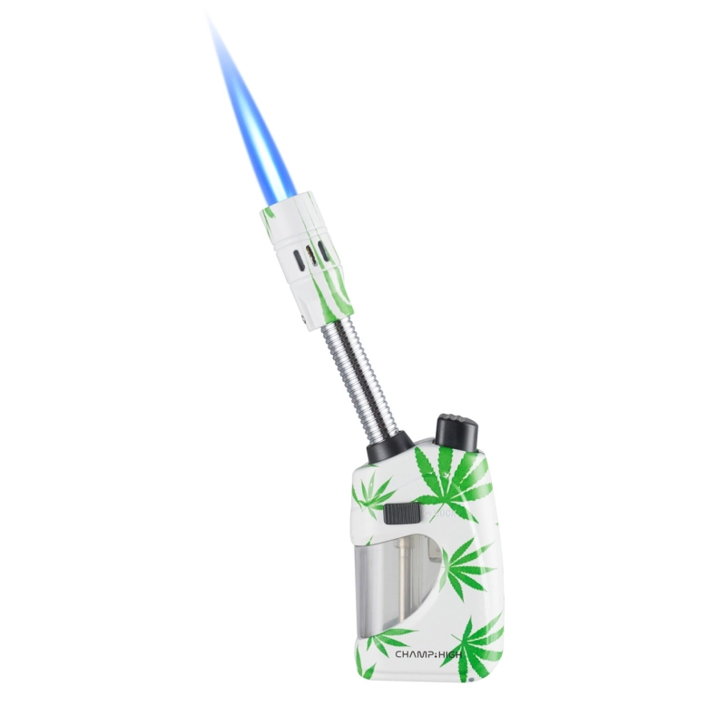 Nachfüllbares Sturmfeuerzeug im Torch-Format mit langem, biegsamem Schlauch, der es ermöglicht, die Flamme in alle Richtungen zu verwenden. Das Feuerzeug ist aus Metall gearbeitet und mit grünen Cannabisblättern verziert.