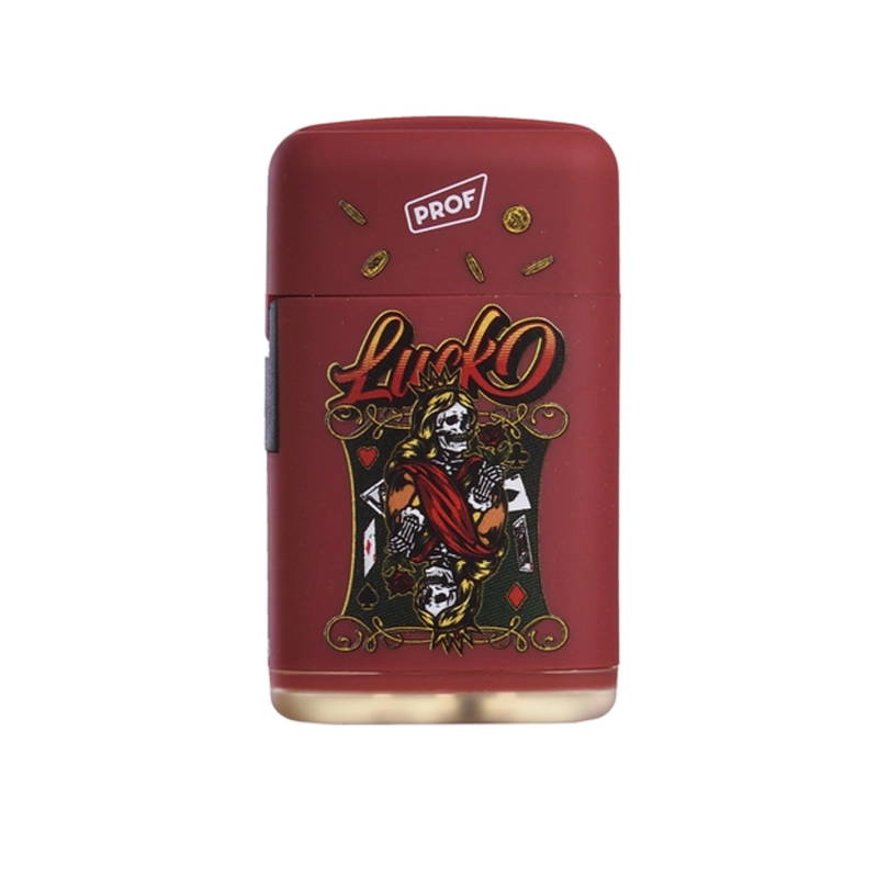 Nachfüllbares Sturmfeuerzeug in einer roten Kunststoffhülle mit einem Skelett im Stile der Königin eines Kartenspiels, die Rosen in den Händen hält.