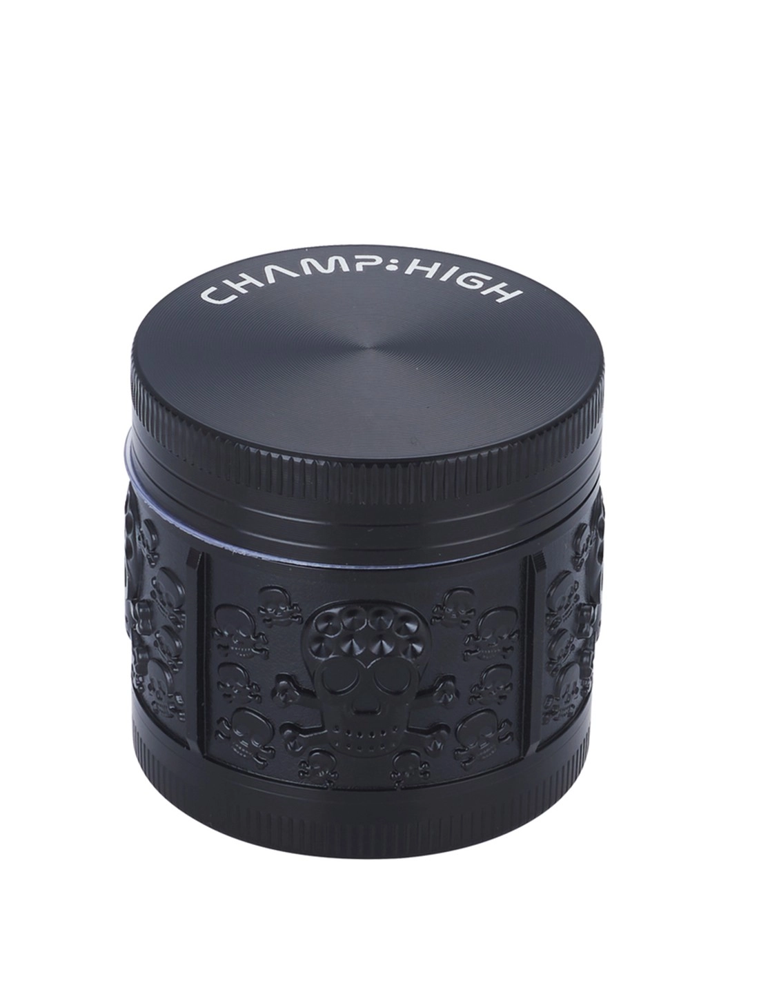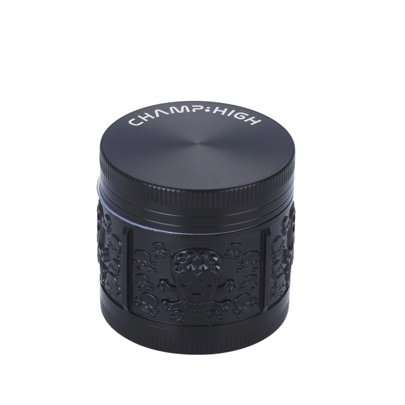 4-teiliger Grinder aus Metall mit einem Durchmesser von 40 mm und einem Sieb, um den Pollen deiner Lieblingskräuter aufzufangen. Dieser schwarze Grinder ist an der Seite mit kleinen eingravierten Totenköpfen verziert.