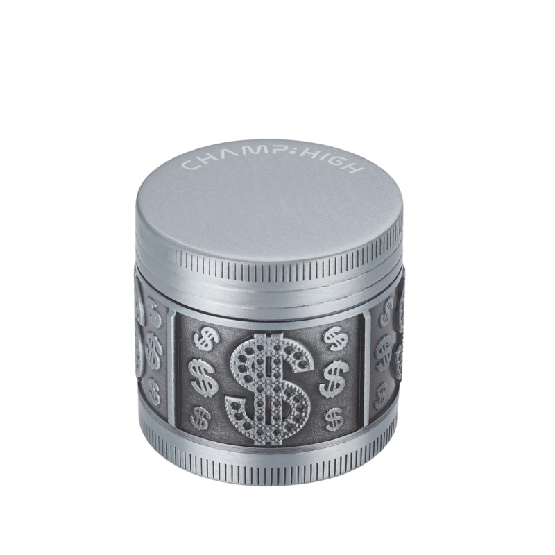 4-teiliger Grinder aus Metall mit einem Durchmesser von 40 mm und einem Sieb, um den Pollen deiner Lieblingskräuter aufzufangen. Dieser silberfarbene Grinder ist an der Seite mit kleinen eingravierten Dollarzeichen verziert.