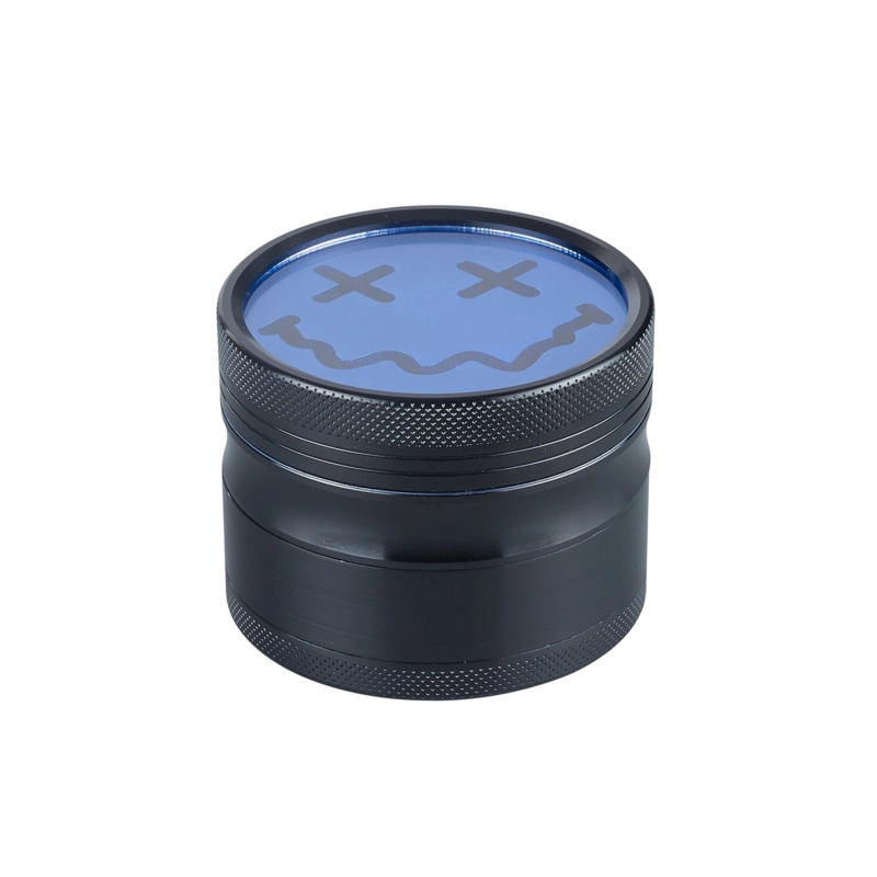 4-teiliger Grinder aus Metall mit einem Durchmesser von 63 mm und einem Sieb, um den Pollen deiner Lieblingskräuter aufzufangen. Dieser Grinder besitzt einen durchsichtigen Deckel, der mit einem blauen Smiley verziert ist.