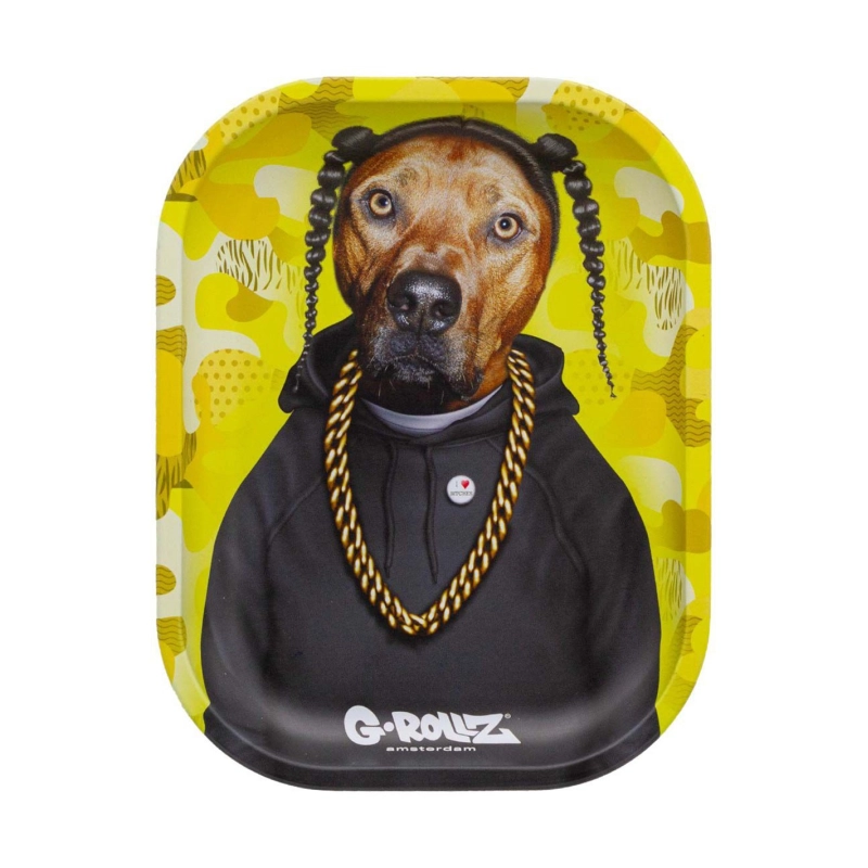 Gelbes Mischbrett aus Metall der Marke G Rollz mit der Abbildung eines Hundes, der an den berühmten Rapper Snoop Dogg erinnert.