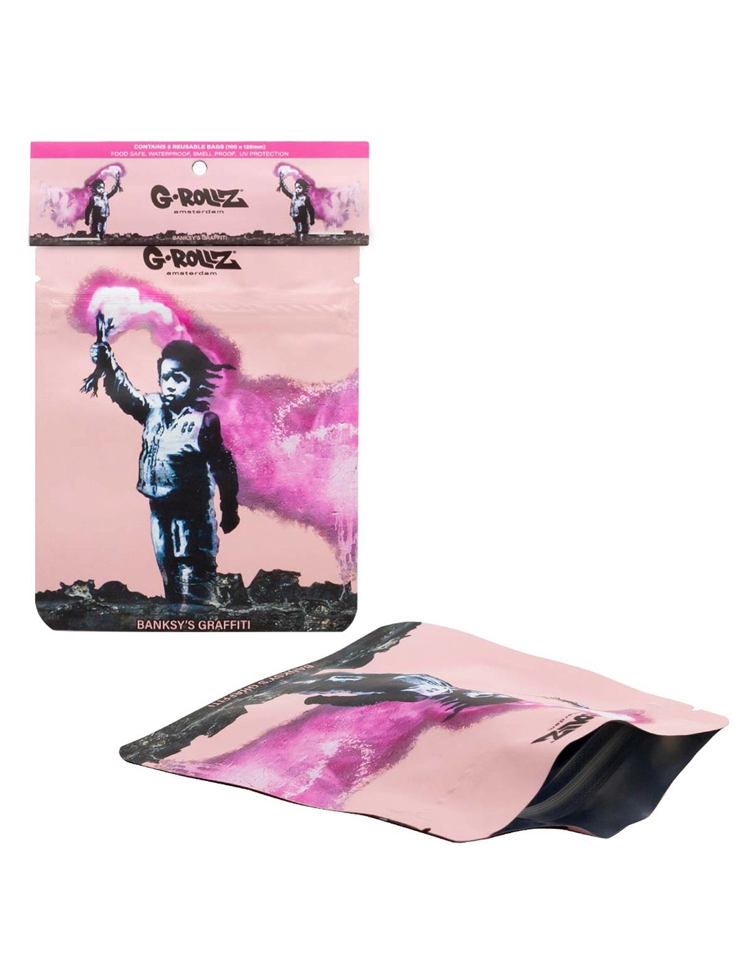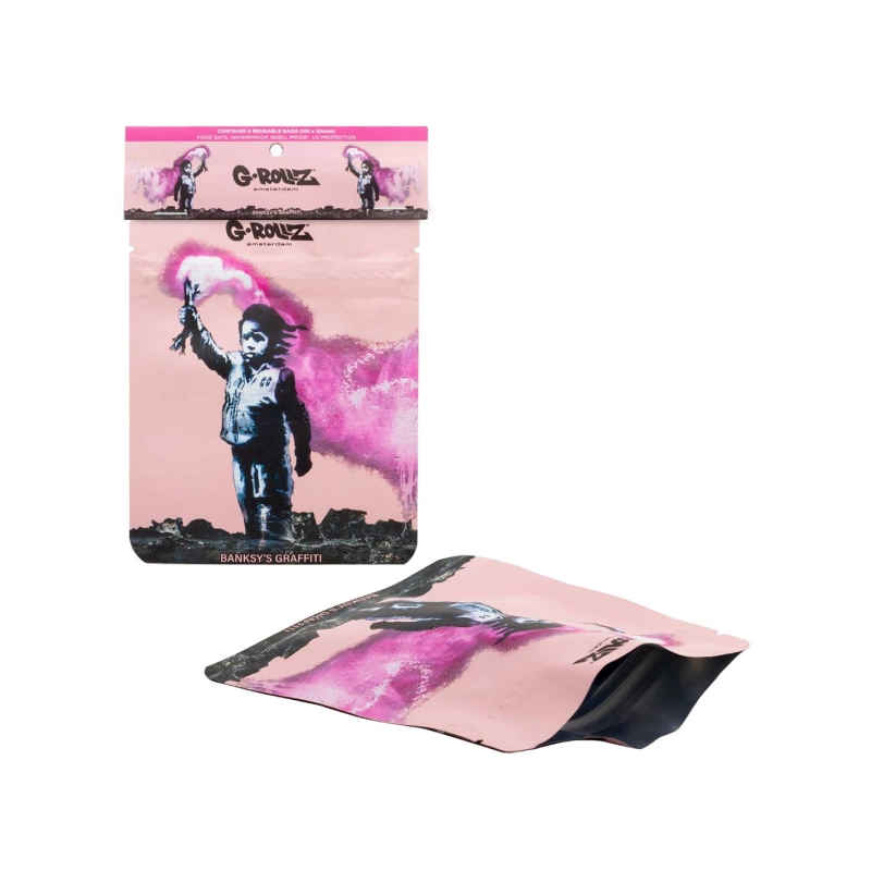 Geruchsneutraler Minigrip-Beutel in der Grösse 10 x 12,5 cm der Marke G Rollz mit der aufgedruckten Abbildung eines Kindes, das eine Fackel in den Himmel hält, aus der Banksy-Graffiti-Kollektion.