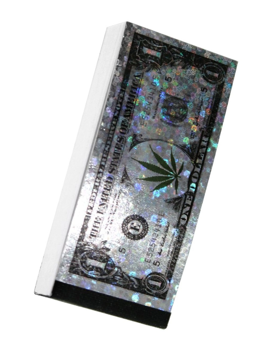 Packung mit 40 mit Lebensmittelfarbe bedruckten "Cannadollars" Filtern 60 x 25 mm.