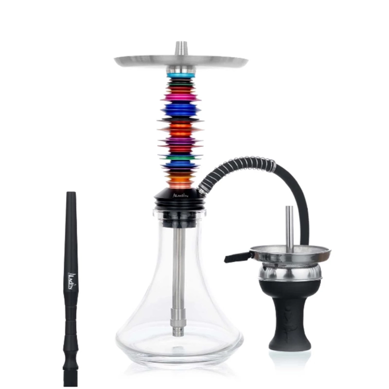 Einschlauchige Shisha des deutschen Herstellers Aladin mit einer transparenten Bowl und einer wunderschönen mehrfarbigen Rauchsäule. Diese Shisha wird mit einer Bowl im russischen Stil geliefert, die kein Schraubgewinde hat, sondern lediglich eine Dichtung, die die Säule zusammenhält.