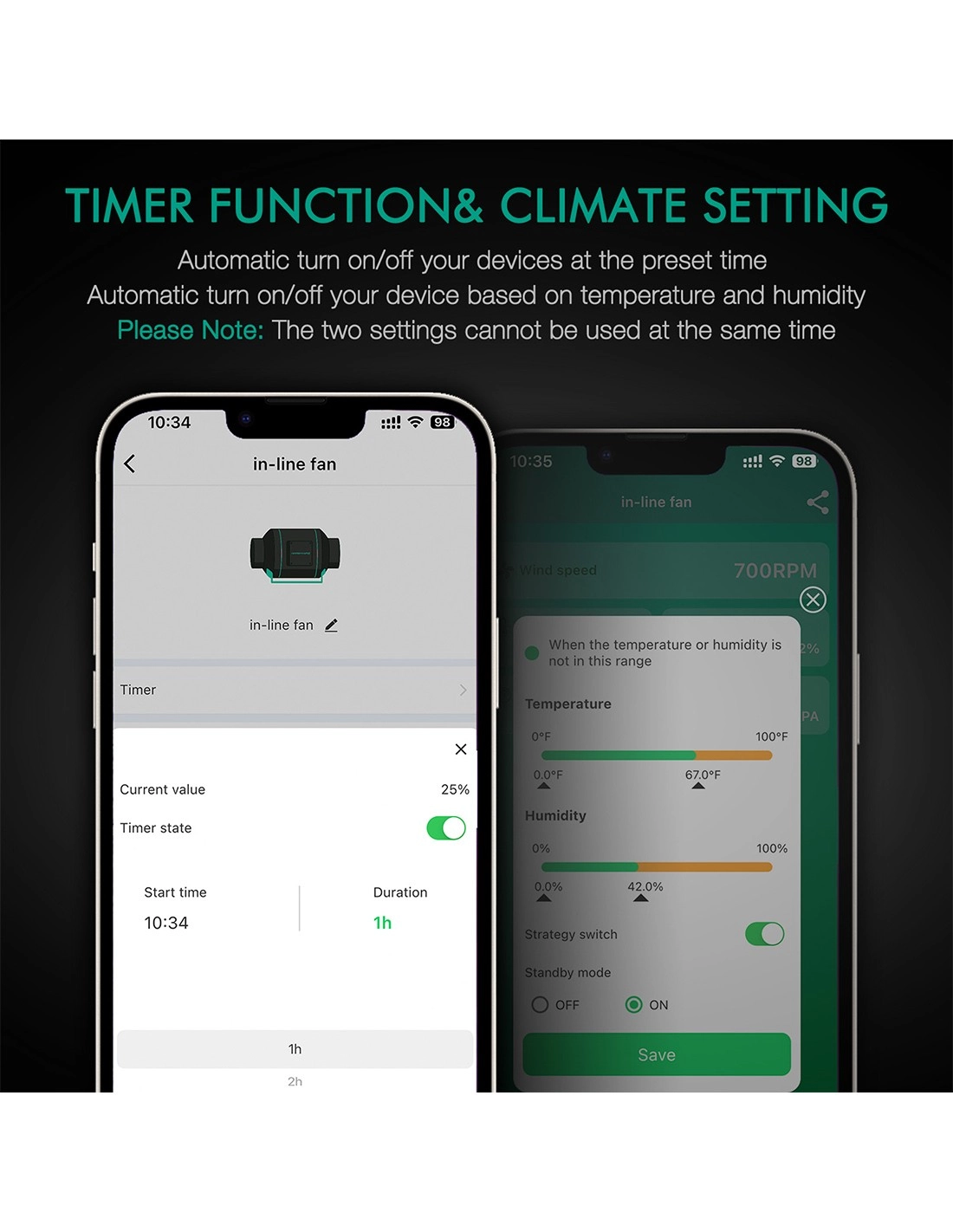 Loggen Sie sich in die Mars Hydro App ein und profitieren Sie von einer bequemen OTA-Fernsteuerung und dem Zugriff auf intelligente Funktionen wie Alarme, Temperaturauslöser und Loop-Timer. Mit nur wenigen Klicks auf Ihrem Smartphone können Sie die Lüftergeschwindigkeit einstellen, die Ein-/Aus-Funktionen steuern und die Geräteprogrammierung automatisieren. So können Gärtner ihre Anbauflächen präzise und mühelos bewirtschaften.