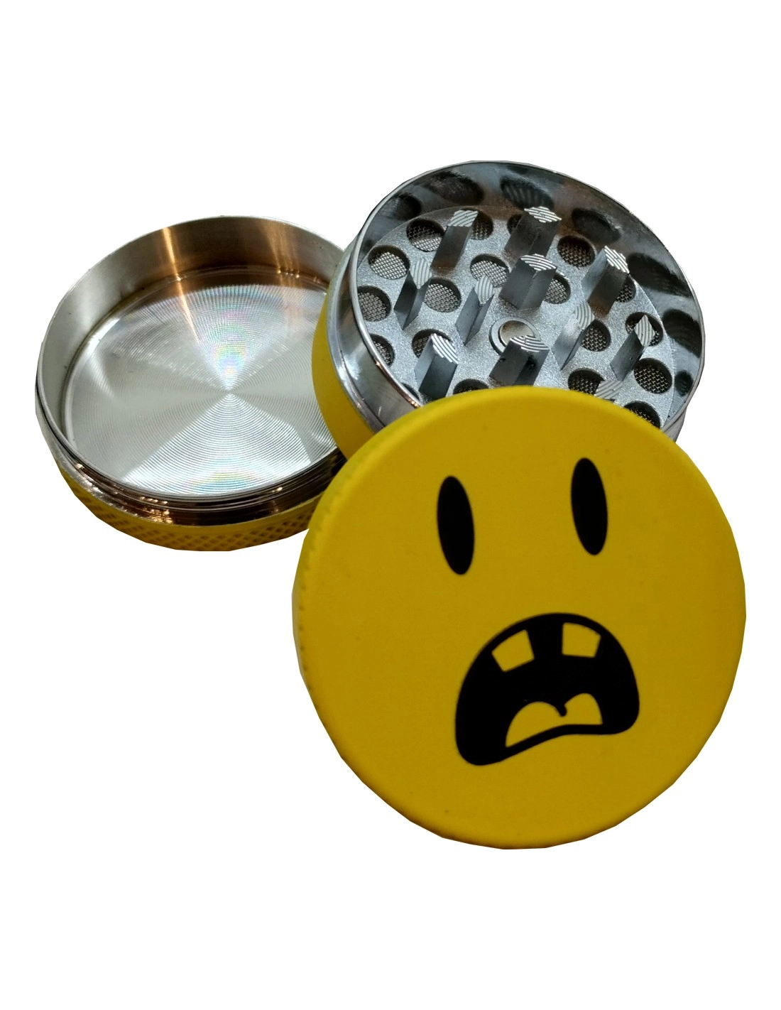 Champ High Metall-Grinder in gelber Farbe mit einem ängstlichen Smiley auf dem Deckel und einem Durchmesser von 40 mm. Der Grinder besteht aus drei Teilen, von denen einer mit einem Sieb versehen ist, mit dem du die Blütenpollen deiner Lieblingskräuter sammeln kannst.