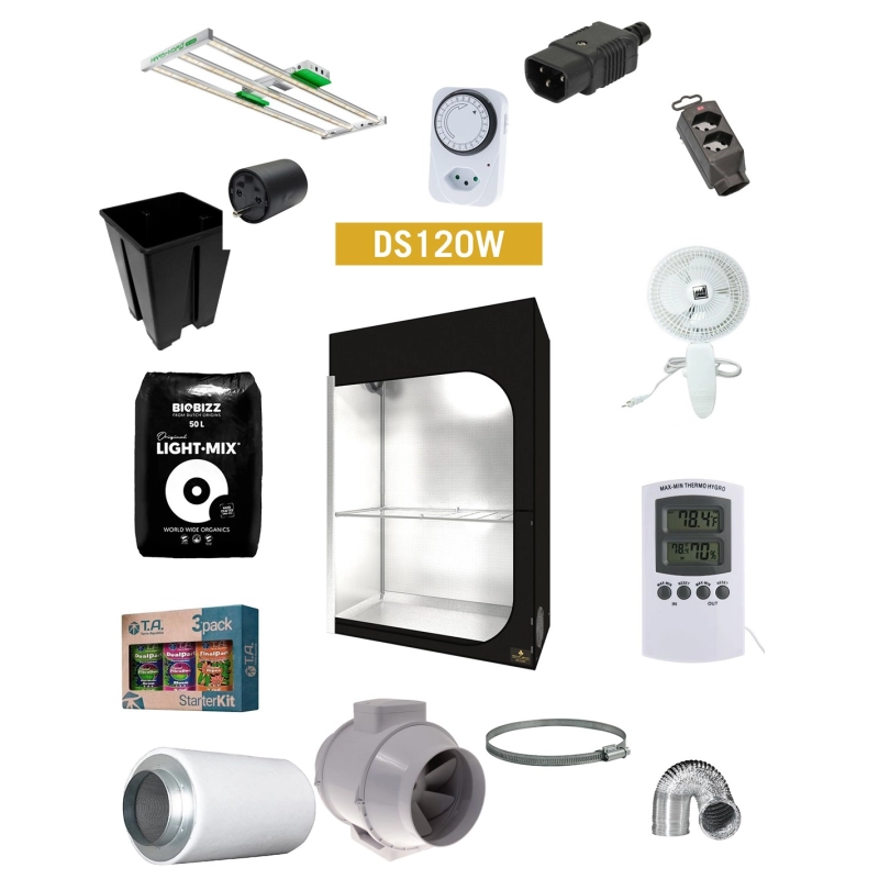 Komplettes Grow Set mit einer Dark Street 120 W 4.0 Grow Box à 60 x 120 x 180 cm. Mit Mars Hydro FC-4000 Evo LED. Das Angebot umfasst alle notwendigen Geräte für einen erfolgreichen Indoor-Anbau mit 18 Töpfen zu je 3,6 l.