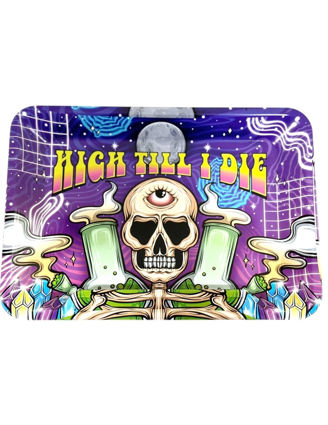 Mischbrett aus Metall der Marke Wises Skies in den Massen 14 x 18 cm mit der Abbildung eines Totenkopfes, der von qualmenden Bongs umgeben ist.