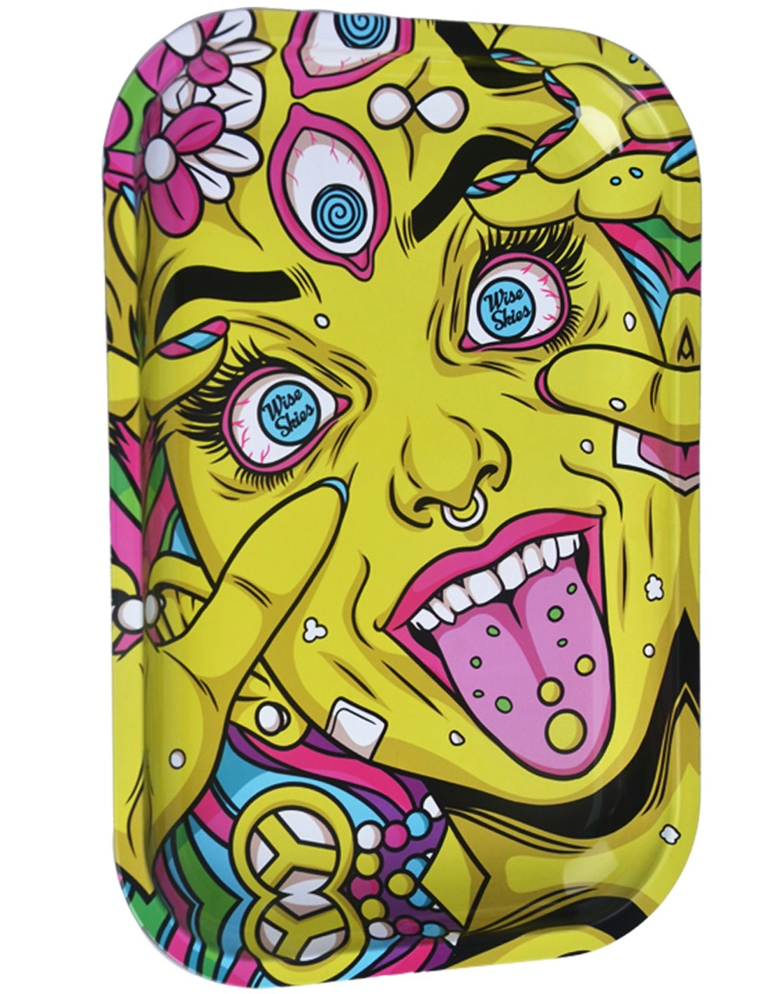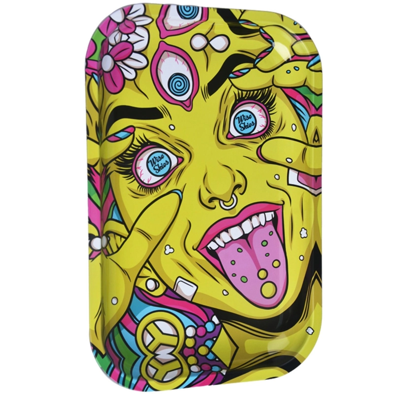 Mischbrett aus Metall der Marke Wises Skies in den Massen 17,5 x 27,5 cm mit der psychedelischen Abbildung einer gelben Frau, die ihre Augen weit aufreisst, in denen sich das Markenlogo widerspiegelt. Cooler Comic-Style.