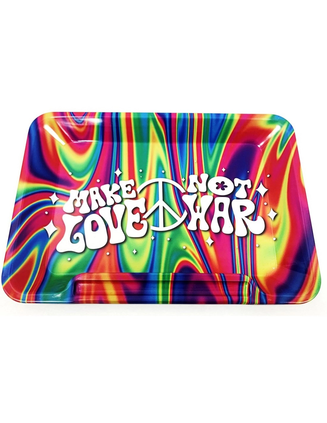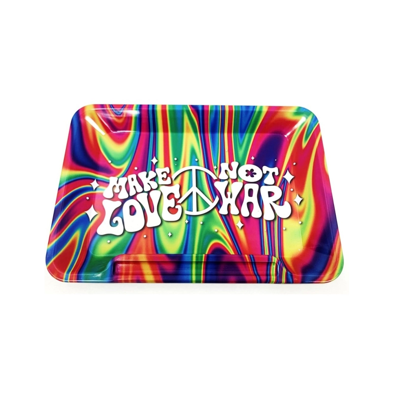 Mischbrett aus Metall der Marke Wises Skies in den Massen 14 x 18 cm in psychedelischen bunten Farben und mit dem Credo der Flower-Power-Generation: "Make Love Not War".