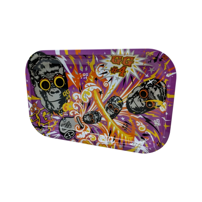 Poppiges Mischbrett aus Metall in der Grösse 29 x 19 cm mit stilisierten Gorillas im Comic-Style und der Aufschrift "GG4" (Gorilla Glue 4). Mit diesem praktischen Mischbrett ist Schluss mit lästigen Tabakkrümeln, die beim Drehen deiner Joints überall hin fallen.
