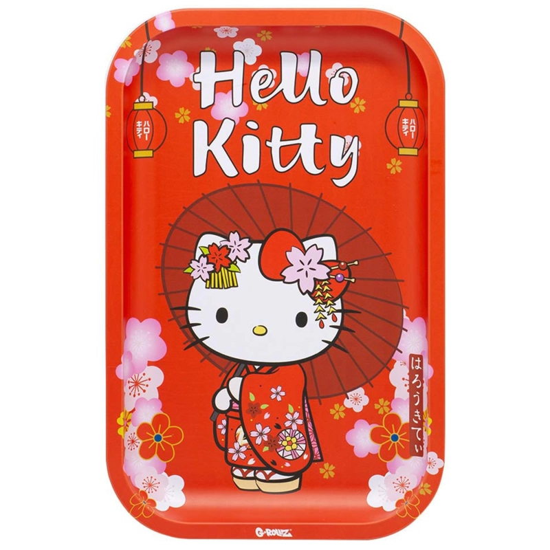 Rotes Mischbrett aus Metall der Marke G Rollz mit der originellen Darstellung von Hello Kitty im Kimono. Das praktische Mischbrett bietet Platz für all deine Drehutensilien. Endlich Schluss mit lästigen Tabakkrümeln, die beim Drehen deiner Joints überall hin fallen.