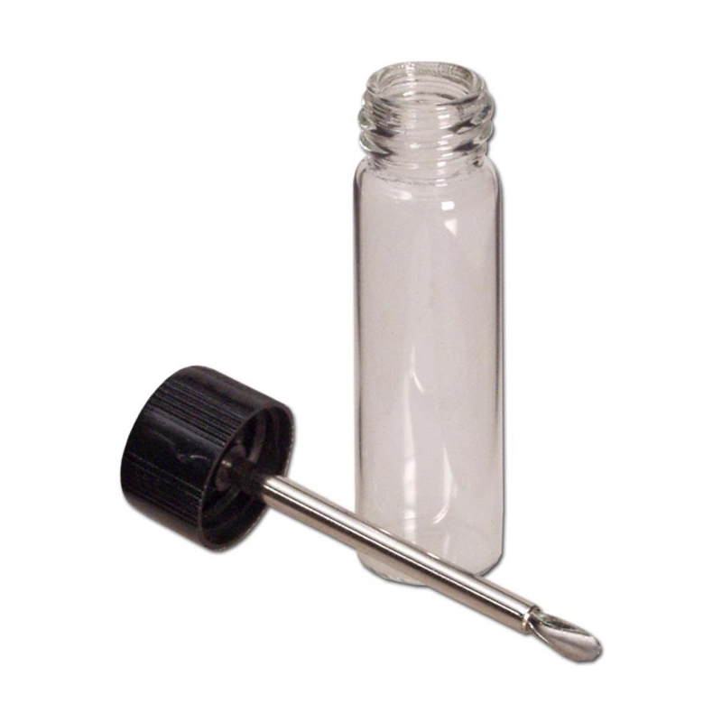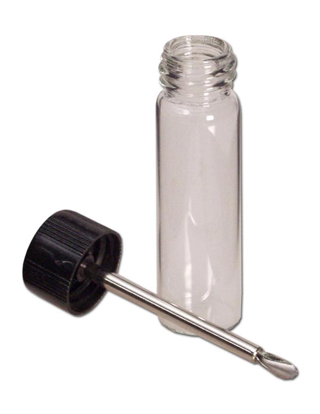 Diese kleine 50 mm hohe Glasflasche mit einem Durchmesser von 15 mm und einem Teleskoplöffel aus Metall eignet sich zur Aufbewahrung und zum Konsum von Schnupftabak.